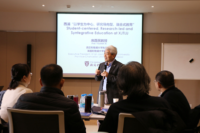 赴西交利物浦大学研究导向型教学专题研修分三个模块。模块一是研究导向型教学的理念与价值,西交利物浦大学执行校长席酉民教授以“以学生为中心、研究导向型、融合式教育”为题,领导与教育前沿研究院副院长张晓军博士“以学生为中心、研究导向型、融合式教育”为题,分享了“以学生为中心”的育人理念及体系、研究导向型教学的内涵、目标、价值,两位学生代表以自身视角和成长经历,交流了在此模式下学生的学习体验和收获;模块二是研究导向型教学的方法与过程,教务长Chin Chee Seong教授以“以学生为中心的课程与专业建设”为题,物理系于昊副教授以“科幻电影作为多学科大班教学的工具”为题,基础数学系郭镜明教授以“围绕学生能力培养,挖掘新素材,开拓新视角”为题,从专业化建设、课程管理和教学实践案例出发,向大家介绍了研究导向型教学的教学目标管理逻辑、课程设计思路和质量控制的具体流程;模块三是研究导向型教学行动学习,城市规划与设计系陈冰副教授、健康与环境科学系秦素洁博士分别举办了专题工作坊,带领大家体验了研究导向型教学课程设计的思路和流程,以及教学实施的方法和途径。研修期间,老师们实地参观了学校的图书馆和博物馆,体验了西浦“以学生为中心”的学习成长环境。