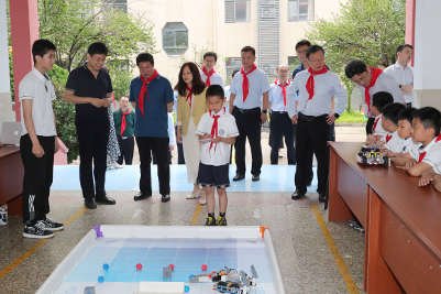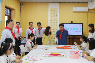 在附属小学举办的“花开新时代·绽放新精彩”社团风采展示活动中,学校领导一行共同参观了以衍纸、机器人、书法、魔方为典型的实践类社团,以轮滑、棒球、乒乓球、网球为代表的体育类社团,以合唱、舞蹈、朗诵、武术为特色的艺术类社团,共同观看了学校精彩纷呈的艺术展演节目,同学们为前来慰问的学校领导佩戴红领巾。