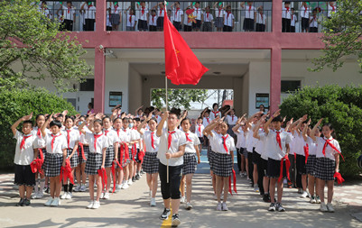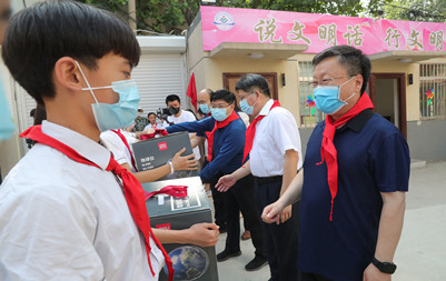随后,张士强一行来到附属小学,少先队员为其佩戴红领巾。大家详细了解了学校课后服务、课程建设、教育教学与疫情防控等有关情况,参观了一年级学生入队仪式。