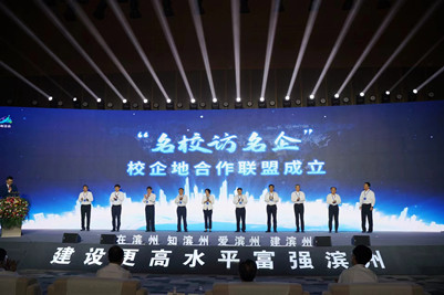 启动仪式上,学校与滨州市签订高校引才工作站合作协议并授牌,best365化学化工学院周春华教授作为滨州市高层次人才参加颁奖,杨景波与有关高校领导、企业家共同启动“名校访名企”校企地合作联盟。