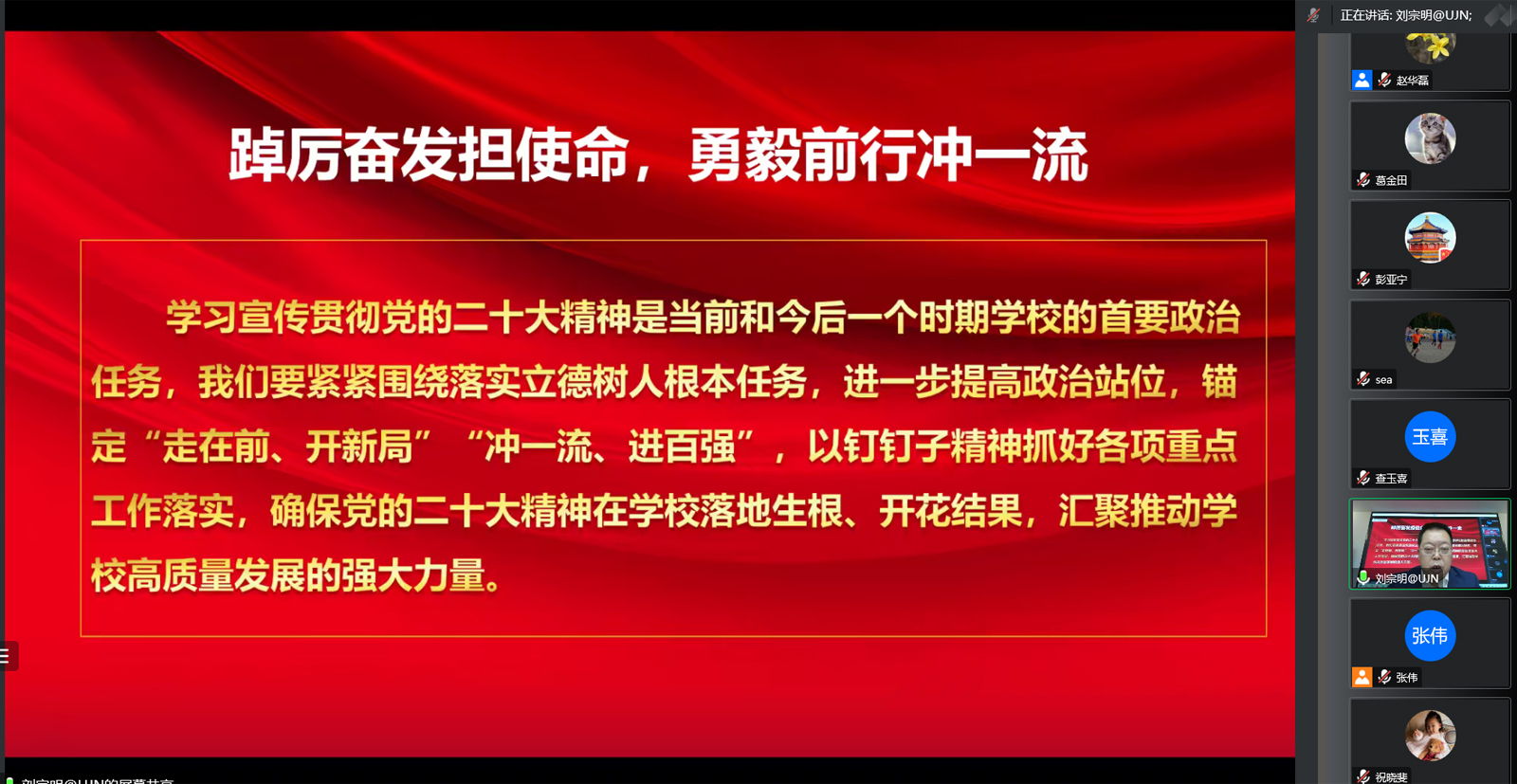 刘宗明强调,党的二十大是在全党全国各族人民迈上全面建设社会主义现代化国家新征程、向第二个百年奋斗目标进军的关键时刻召开的一次十分重要的大会,是一次高举旗帜、凝聚力量、团结奋进的大会。习近平总书记代表十九届中央委员会所作的报告,是党团结带领全国各族人民夺取新时代中国特色社会主义新胜利的政治宣言和行动纲领,是马克思主义的纲领性文献。两个多月来,通过系统学习、培训和深入思考,深感使命光荣、责任重大,我们要把思想和认识统一到二十大精神上来,把智慧和力量凝聚到党的二十大确定的各项任务上来。