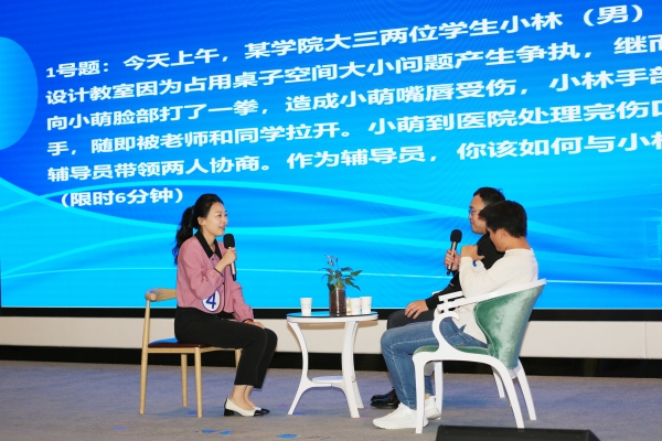 决赛分为谈心谈话和理论宣讲两个环节,采用随机抽题、现场演绎、当场出分的方式进行。谈心谈话环节,参赛选手在助演的配合下,用扎实的理论基础、专业的沟通技能、灵活的应变能力、真挚的情感表达与学生和家长耐心倾听、细心疏导、真心服务,以情载理,理情交融,展现了辅导员的担当和情怀。理论宣讲环节,参赛选手以“点亮青春理想”“激昂奋斗旋律”“淬炼斗争精神”“澎湃创新动力”为题,围绕学习贯彻落实习近平新时代中国特色社会主义思想,立足时代发展新要求和学生成长新特点,讲述身边的故事,诠释初心使命,展现了辅导员的专业能力和水平。