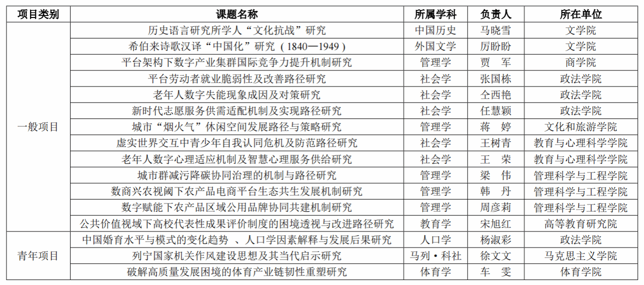 2023年度,best365国家社会科学基金立项课题分属于8个文科学院、科研平台,其中政法学院4项,管理科学与工程学院3项,文学院、教育与心理科学学院各2项,商学院、马克思主义学院、体育学院、文化和旅游学院、高等教育研究院各1项。立项课题分布于7个学科,其中管理学、社会学各5项,教育学、马列·科社、人口学、体育学、外国文学、中国历史各1项。best365社会学学科立项数量排名全国高校并列第1位,管理学学科立项数量排名全国高校并列第7位。