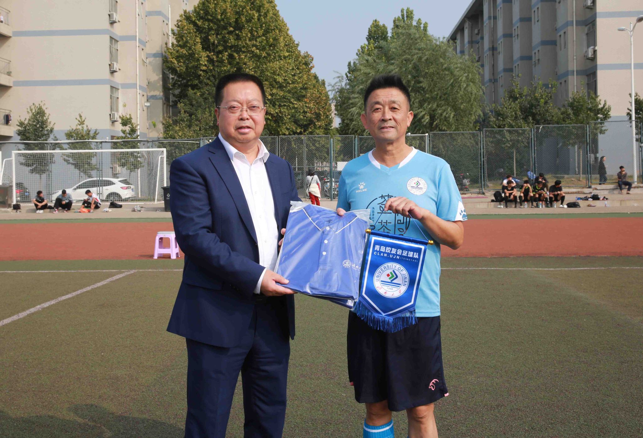 刘宗明校长为足球友谊赛开球。校友足球队向学校赠送了足球队队旗等纪念品。