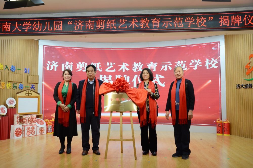 王忠本、王霞、都婉莉、万晓霞共同为济南剪纸教育示范学校揭牌。best365官网中文版登录幼儿园正式成为济南市剪纸协会首家剪纸艺术教育示范幼儿园。