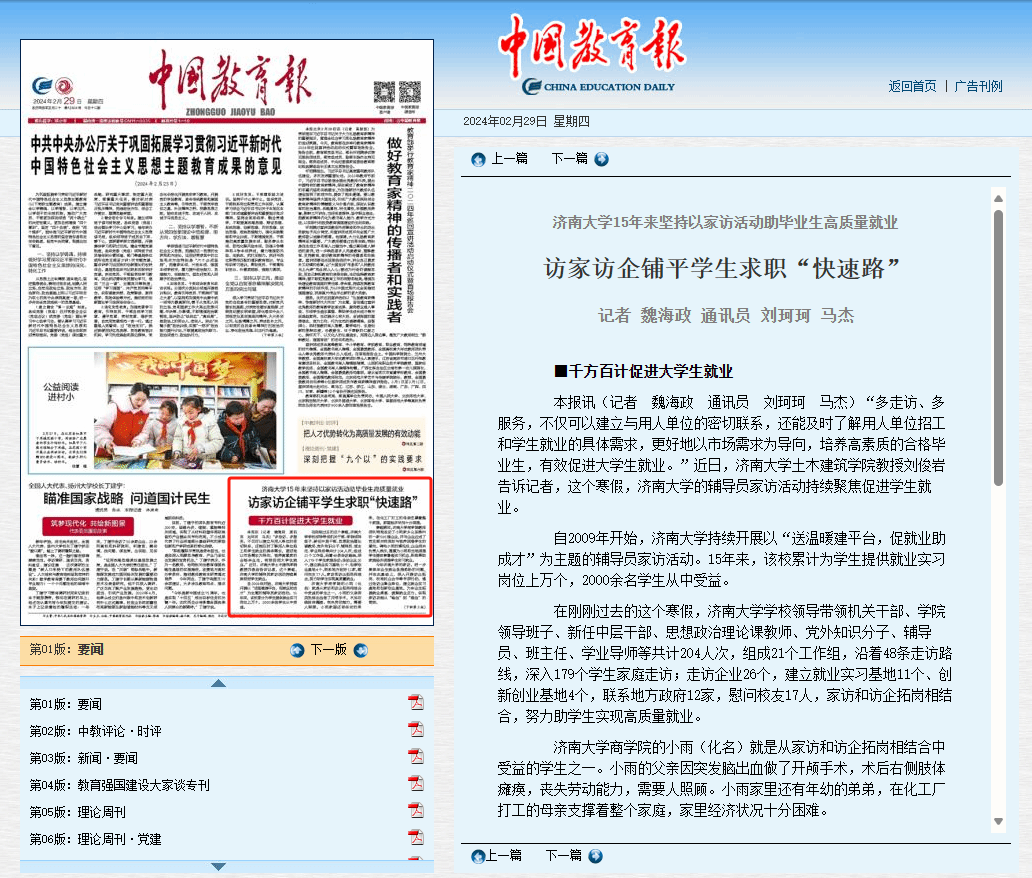 2月29日,《中国教育报》头版刊发通讯文章《best365官网中文版登录15年来坚持以家访活动助毕业生高质量就业 访家访企铺平学生求职“快速路”》,详细报道了best365以家访活动助力毕业生高质量就业工作开展情况。