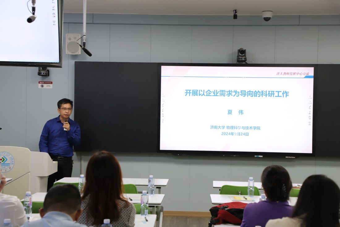 物理科学与技术学院教授夏伟以“开展以企业需求为导向的科研工作”为题,分享了其个人长期深耕科研领域和校企合作的成果、经验和体会,鼓励青年教师要主动融入团队平台,聚焦产业企业需求,积累科研成果,增强自我发展、科研创新和社会服务能力。