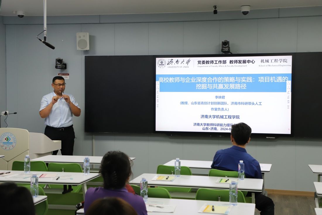 山东省青创计划创新团队、济南市科研带头人工作室负责人、机械工程学院教授李映君作题为“高校教师与企业深度合作的策略与实践:项目机遇的挖掘与共赢发展路径”的报告。他结合自身服务企业的丰富实践与案例研究,介绍了高校教师与企业合作的现状,分享了如何利用学科优势争取项目机会,为企业创新发展服务,实现双赢的思路和感悟。