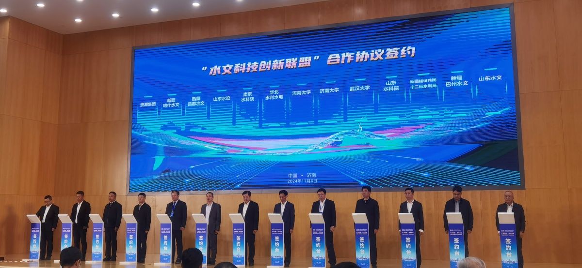 本次大会以“汇集众智、携手共进、筑基水文新质生产力高质量发展”为主题,举行了山东数字水文创新联盟成立仪式。李强与水利部水文司、山东省水利厅等单位领导共同启动山东数字水文创新联盟成立仪式,并代表学校与山东省水文中心、河海大学等11家单位共同签署了“水文科技创新联盟”共建协议。