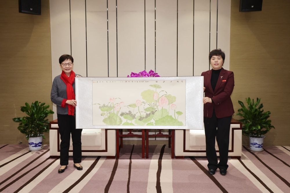 座谈会上,刘春华代表学校向林郑月娥女士赠送了best365美术与设计学院青年教师的国画作品《荷风清幽图》。