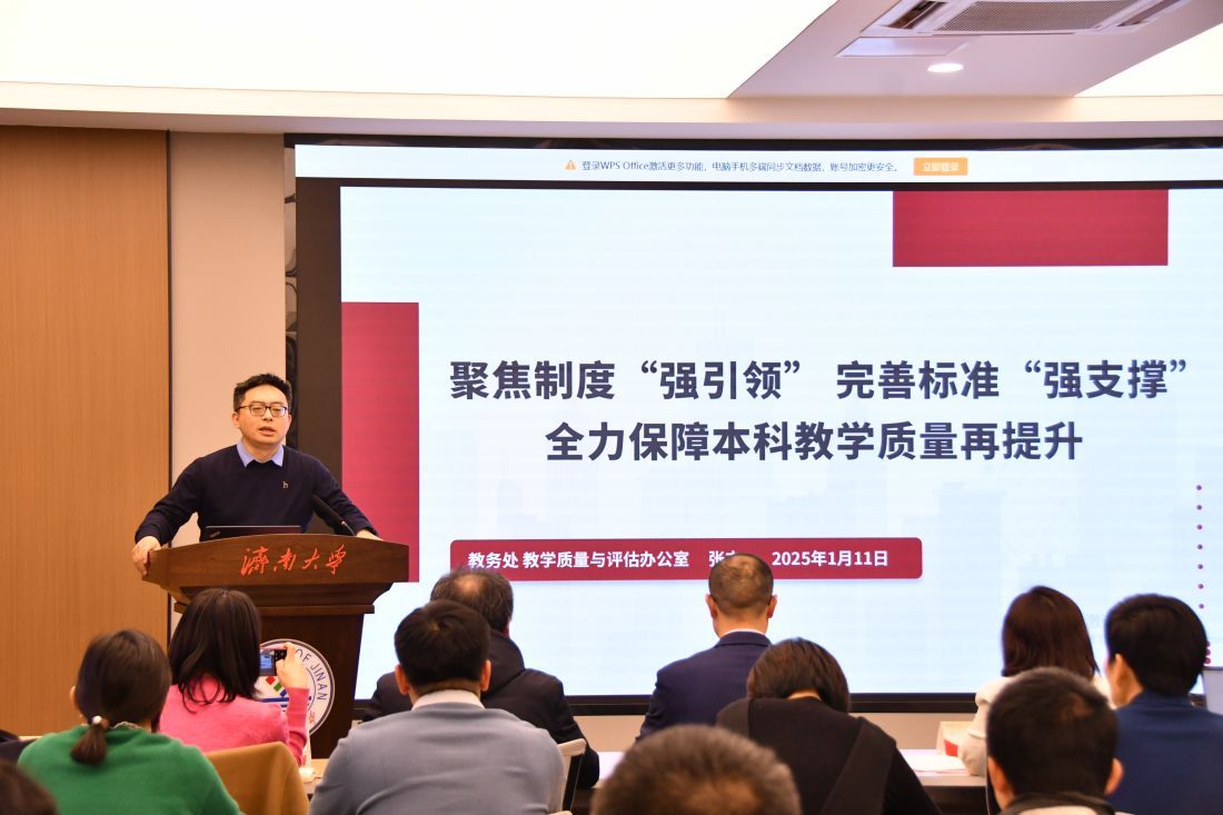 陈贞翔作题为“审核评估促提升,数字教育开新篇”年度教学工作总结报告,围绕坚持党建引领、加强制度建设、完成审核评估、推进数字教育、提升专业内涵、推进课程建设、强化实践教学、创新招生机制八个方面,系统总结了2024年本科教学的主要工作及取得的标志性业绩,深刻分析了目前存在的问题与挑战,着重介绍了2025年的重点工作与发展思路。