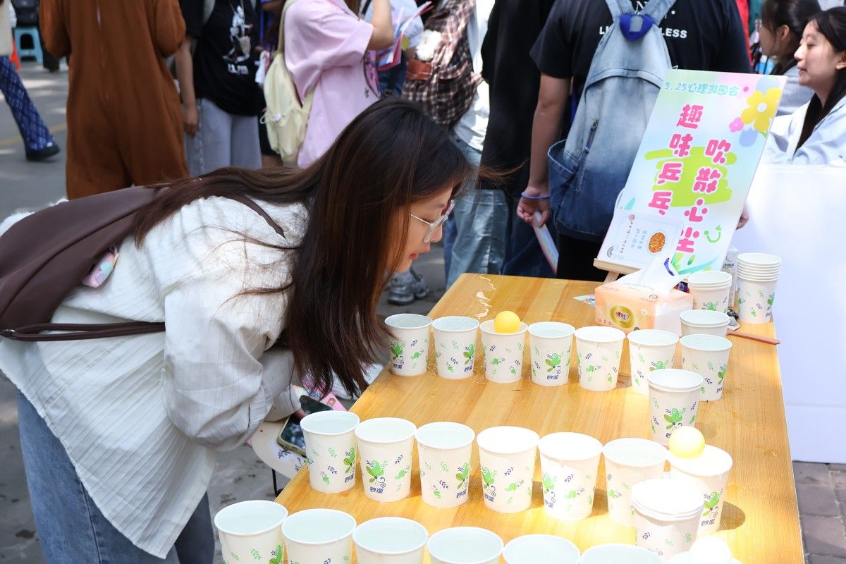 心理游园会以阳光心理为核心理念,设置“知心区”“润心区”“动心区”“可心区”“甜心区”“悦心区”六大活动区域,通过心理义诊、运动减压、艺术疗愈、知识问答、朋辈辅导、心理测评、个体咨询和团体辅导等多种活动形式,引导学生提升心理素养,发现守护心灵的N种可能。“知心区”设置“专家义诊,心屿摆渡”活动,邀请济南市精神卫生中心心理专家开展心理义诊。“润心区”设置“OH 卡牌,心镜探真”“测评咨询,心域导航”“朋辈辅导,心语共聆”活动,通过潜意识探索、心理测评、心理辅导帮助学生认识自我,滋润心灵。“动心区”设置“趣味乒乓,吹散心尘”“彩绘泥塑,心彩绽放”活动,通过运动疗愈、艺术疗愈缓解压力、放松心情。“甜心区”设置“棉花糖DIY,甜到心里”活动,通过手工制作和食物疗愈探寻自我关怀的方式。“悦心区”设置“学院活动,心灵集市”,各学院现场开展丰富多彩的心理健康活动并展示心理月期间品牌活动及相关成果。终点“可心区”设置“画自画像,心绘自观”“积章套圈,圈住开心”活动,通过自我描绘、积章套圈,总结游园活动,升华育人效果。活动现场气氛热烈,趣味十足,持续吸引数千余名师生前来体验。