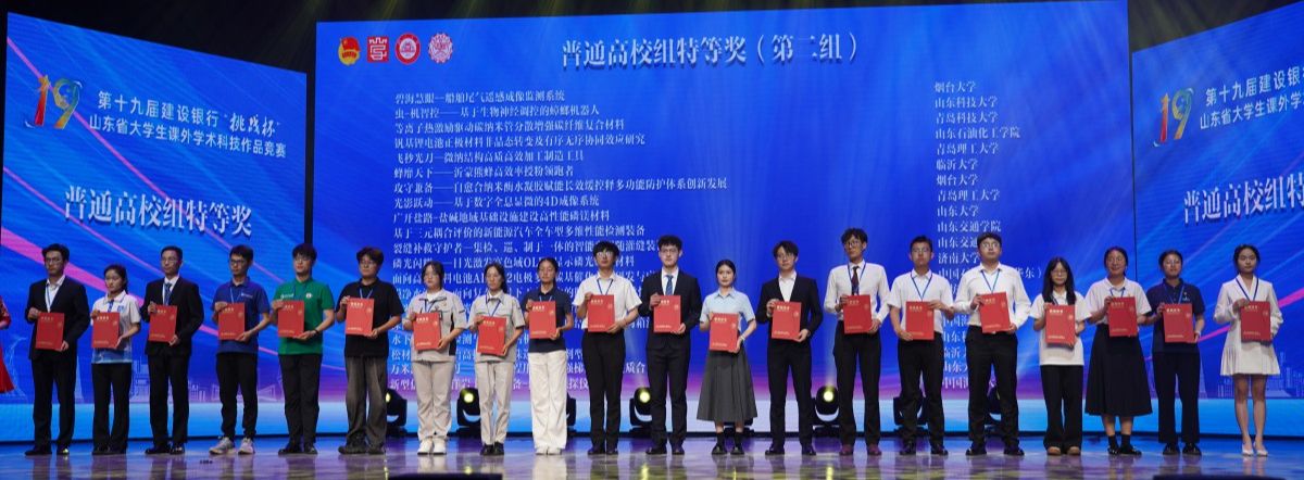 经过现场质询、问辩评审等环节的激烈角逐,化学化工学院《“晶”益求精——高一致性晶圆级二维材料研发及范德华异质集成》《磷光闪耀——日光激发宽色域OLED显示磷光碳点材料》,教育与心理科学学院《脑有所依——基于活体传感的脑内维生素C精准监测及其在缺氧性神经损伤中的机制研究》3件作品获特等奖;化学化工学院《食安“芯”动——基于电磁双场调控的纸基食品污染物快检芯片的制备及应用》,土木建筑学院《约束系统动力学稳定性研究的新方法》,生物科学与技术学院《“碱”入佳剂——一种微生物源生物碱抗菌制剂的研究》《噬退菌安——抗噬菌体芽孢杆菌多功能底盘的构建》《西洋参促生防病生态菌剂走出乡村致富路》5件作品获一等奖;物理科学与技术学院《海上生“明月”——高安全高稳定性的新型可充电海水电池》,材料科学与工程学院《纤迴新生——基于玻纤废丝再生利用的节能型玻璃纤维外墙材料》,信息科学与工程学院《面向野外复杂环境的大蒜鳞芽朝向纠偏播种一体机》3件作品获二等奖;政法学院《黄河流域农业文化遗产保护与乡村可持续发展研究——基于山东省10个遗产区的调查分析》,材料科学与工程学院《城市皮肤2.0:基于磷石膏资源化的活性生态铺装系统》,化学化工学院《“氟”摇直上 “光”驱蓝海——基于太阳能界面蒸发技术的海水淡化膜》,机械工程学院《“无尘骑士”气力垃圾运输系统——城市清洁的强力助手》,音乐学院《各美其美·美美与共:高校美育教育现状与对策研究——基于山东省33所高校的调查分析》,教育与心理科学学院《脑科赋能——孤独症脑科学诊疗技术应用现状及社会生态调查报告》,生物科学与技术学院《碱默寡盐——全基因组鉴定玉米F3H基因家族及ZmF3H6提高玉米耐盐碱的功能分析》7件作品获三等奖。