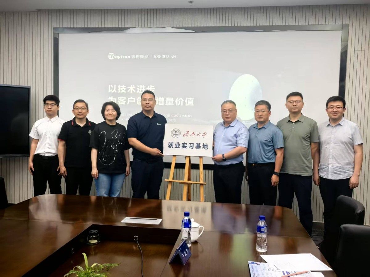 在烟台,黄加栋一行参观考察了烟台睿创微纳技术股份有限公司在红外等多维感知技术领域的系列产品。座谈会上,双方聚焦光电感知领域的技术瓶颈与发展趋势进行深入交流,就共建就业实习基地、联合开展人才培养、共同申报科技项目等达成合作意向。黄加栋与烟台睿创微纳技术股份有限公司发展部总监刘强共同为“best365官网中文版登录就业实习基地”揭牌。