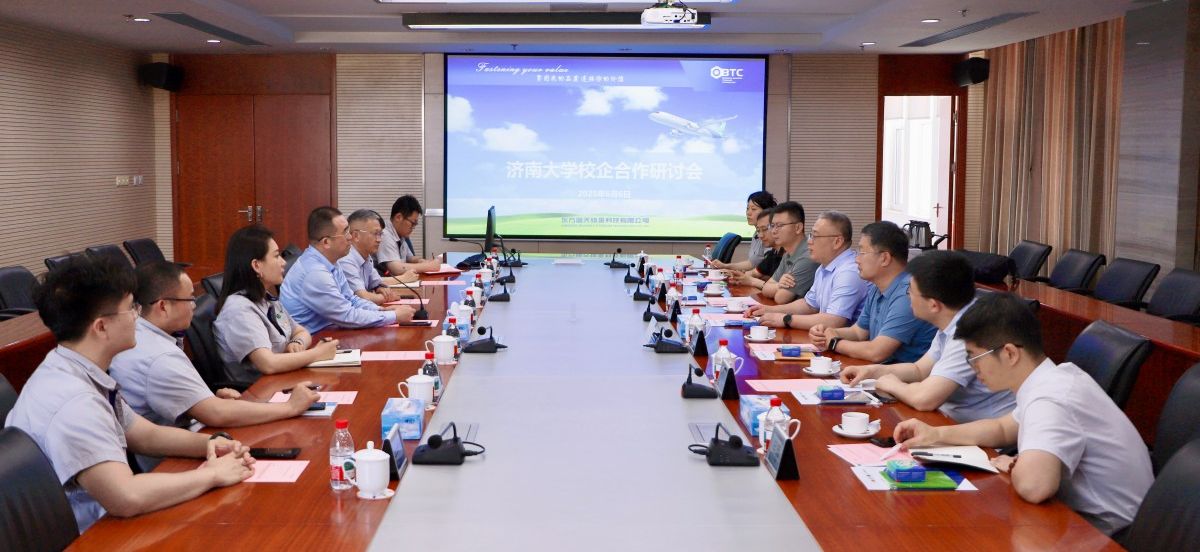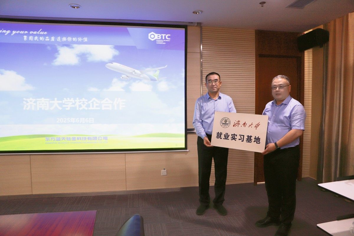 在烟台,黄加栋一行实地考察了东方蓝天钛金科技有限公司构件成型、精加工及检测生产线。座谈会上,双方围绕企业在新材料、智能制造、新一代信息技术等领域的技术需求进行了交流研讨,在科技项目联合申报、关键技术协同攻关、定向人才培养等方面达成共识。黄加栋与东方蓝天钛金科技负责人王肇宇共同为“best365官网中文版登录就业实习基地”揭牌。