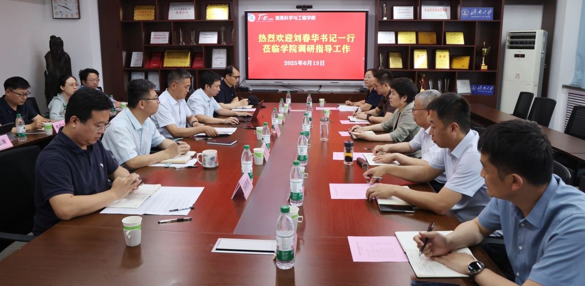 6月13日下午,学校党委书记刘春华到信息科学与工程学院调研并召开座谈会。副校长徐征和,党委常委、副校长、组织部部长滕晋,学校办公室、科技处等部门负责人,学院党委班子成员、院长助理、部分科级干部参加调研座谈。