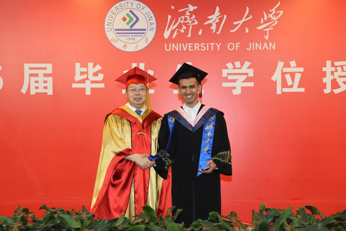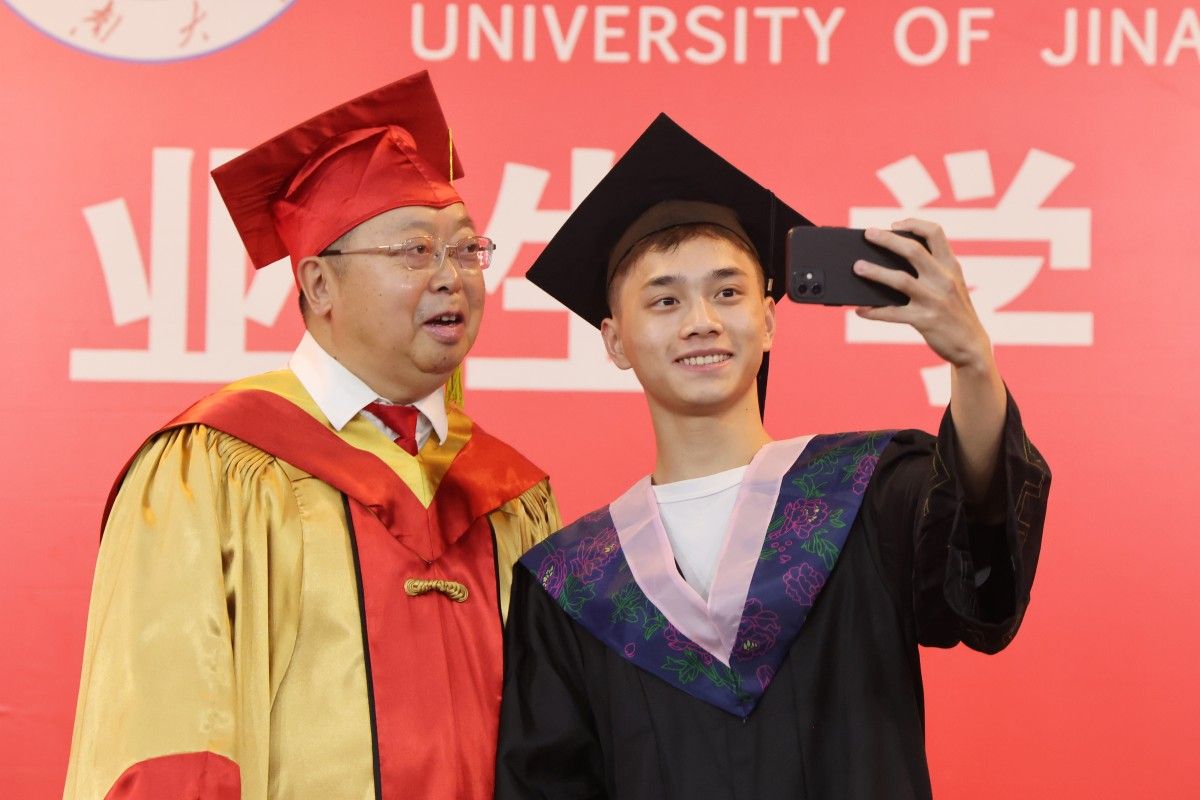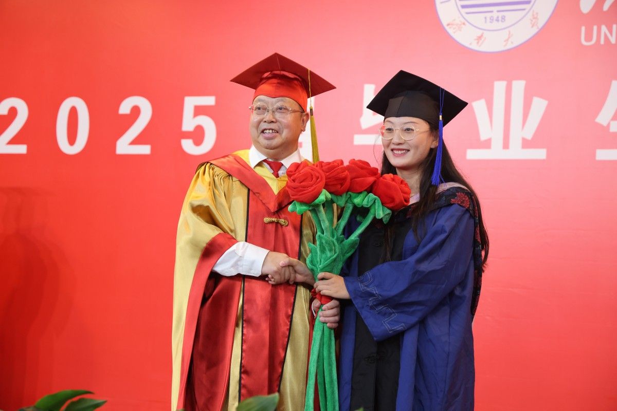 来自各学院的毕业生在师生和家长们的见证下,身着学士服、硕士服、博士服依次上台。校长刘宗明为毕业生一一拨穗、合影留念并亲切鼓励。随后,学院领导、教师和毕业生们一一握手,以表祝贺。