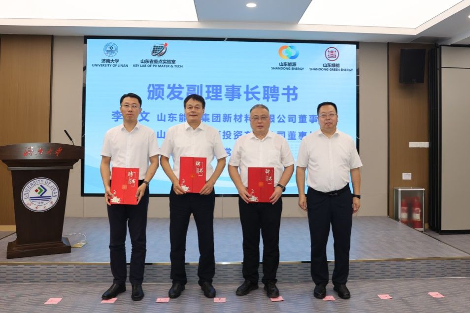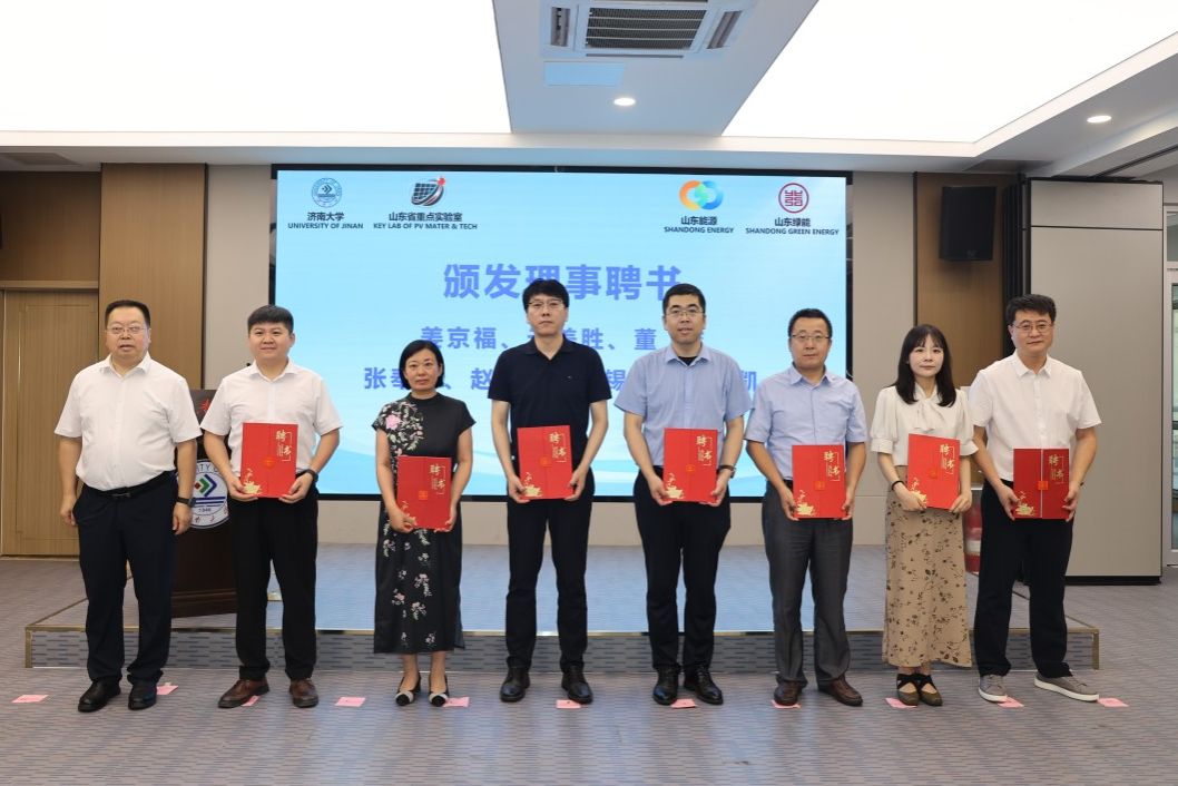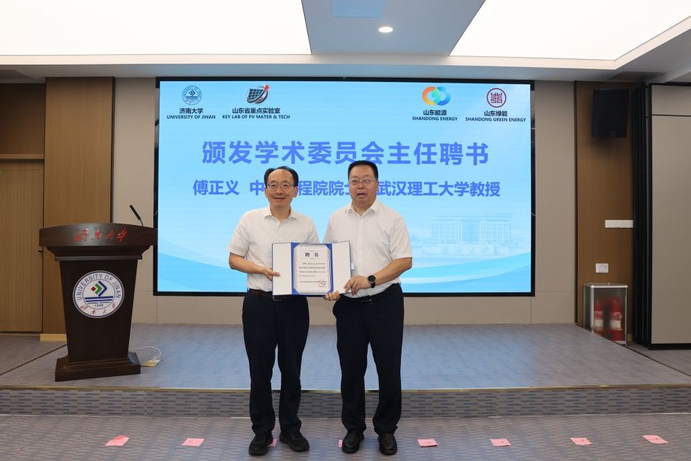 会上,刘宗明和史志远共同为山东省太阳能光伏材料与能源高效利用技术重点实验室(筹)揭牌。刘宗明为学术委员会主任武汉理工大学傅正义院士、理事会成员颁发聘书。傅正义院士为中国科学院合肥物质科学研究院孟国文教授、东北大学孙旭东教授、天津工业大学李越教授、苏州大学李亮教授、核芯光电(山东)科技有限公司张万昌研究员、西北工业大学王洪强教授、中国科学院青岛能源所、山东省能源研究院逄淑平研究员、山东浪潮华光光电子有限公司吴德华高级工程师、山东绿能科技服务有限公司孙冰莹高级工程师、山东大学于伟泳教授、best365官网中文版登录曹丙强教授等学术委员会委员颁发聘书。