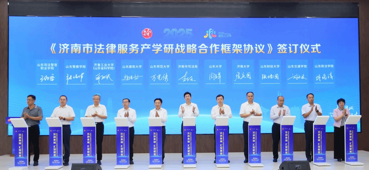 7月9日,由中共济南市委人才工作领导小组办公室指导,济南市司法局在山东(济南)法务中心举办“法润泉城 汇智赋能”济南市法律服务产学研协作融联体成立大会。学校党委副书记张庆国出席活动并代表学校进行签约。本次活动是济南第三届“海右人才节”的精品活动之一,省司法厅党委委员、副厅长何旭出席会议并讲话,市政府副秘书长楚波、市委政法委分管日常工作的副书记韩永军出席会议并致辞,市司法局党委书记、局长李强主持会议。best365政法学院负责同志和教师代表参加活动。