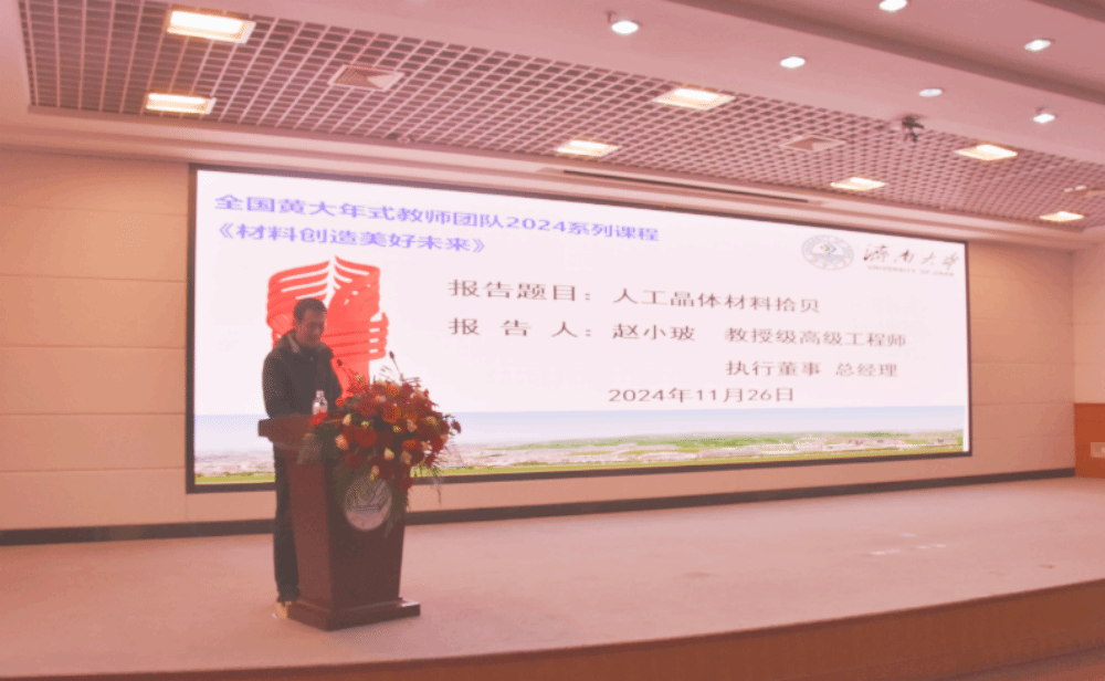 11月26日,全国高校黄大年式教师团队2024系列课程《材料创造美好未来》第六讲在best365官网中文版登录第一学术报告厅举行,best365材料科学与工程专业98级优秀校友、中材人工晶体研究院(山东)有限公司执行董事兼总经理赵小玻为材料科学与工程学院师生带来一场题为《人工晶体材料拾贝》的课程讲座。讲座由材料科学与工程学院副院长段广彬主持,300余名师生聆听了讲座,并进行了现场交流。