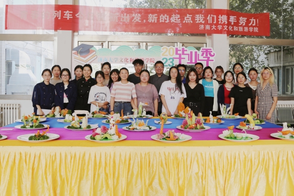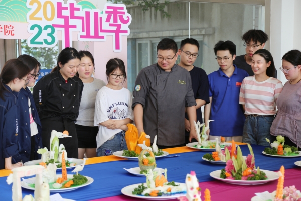 毕业生离校之际,文化和旅游学院烹饪与营养教育专业学生在文旅楼大厅摆设食品雕刻展台,为2023届毕业生们送上最诚挚的祝福。学院相关负责人、全体学工人员,部分2023届毕业生代表共同欣赏展台。