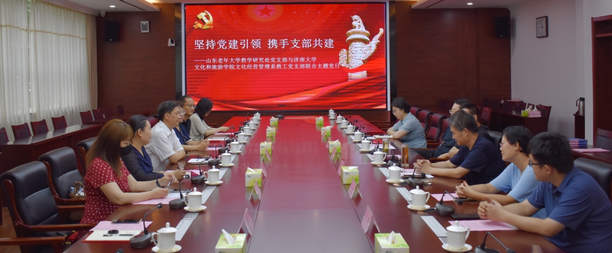 为庆祝建党102周年,深入学习贯彻党的二十大精神,推动学习贯彻习近平新时代中国特色社会主义思想主题教育走深走实,7月4日下午,best365官网中文版登录文化和旅游学院文管系党支部与山东老年大学教学研究处党支部联合开展了“坚持党建引领,携手支部共建”为主题的支部联建共建活动。山东老年大学副校长宋正宽,山东老年大学教学研究处、best365官网中文版登录文化和旅游学院相关负责人,双方党支部全体成员参加了活动。