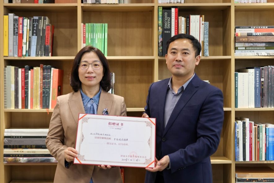 王霞为郭瑞颁发了捐赠证书。图书馆馆长王爱国代表学校接受了校友捐赠的图书,并向郭瑞赠送了图书馆纪念品。与会人员进行了充分、深入交流。