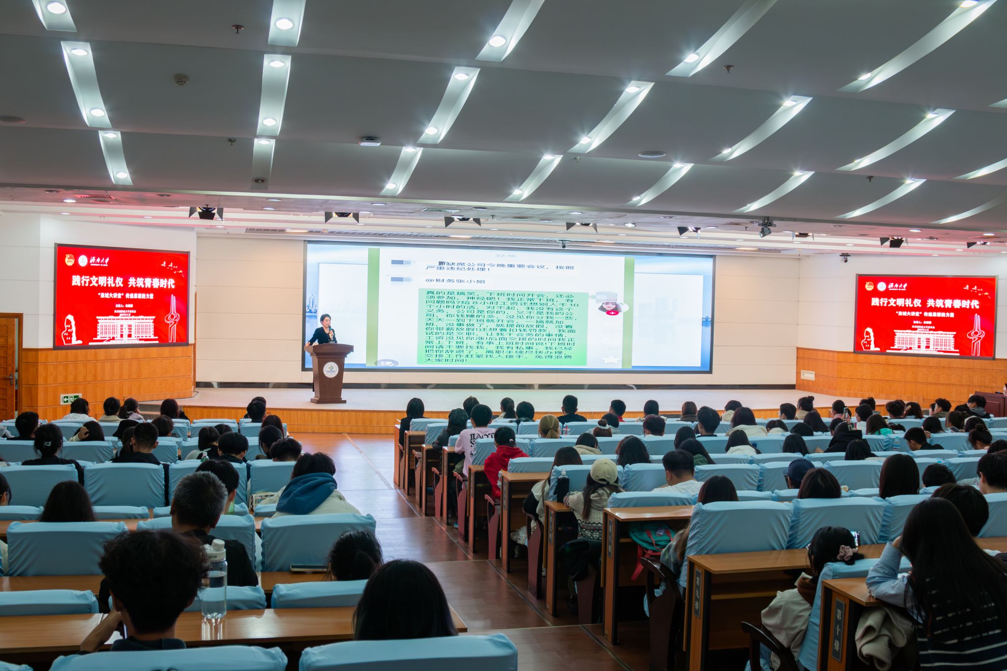 活动中,朱珊珊老师结合自身丰富的生活会阅历,从仪表礼仪、交谈礼仪、电话礼仪、握手礼仪、举止礼仪、谈吐礼仪、面试礼仪等多个方面出发,为即将走出校园、踏入社会的同学们上了重要一课,启示同学们认真学习直至成礼仪,在生活中自觉养成良好的文明习惯,努力做优雅大方、豁达乐观、明礼诚信的新时代青年。整场讲座精彩纷呈、生动深刻,让同学们在学和做的过程中感受到了文明礼仪的美好和重要。