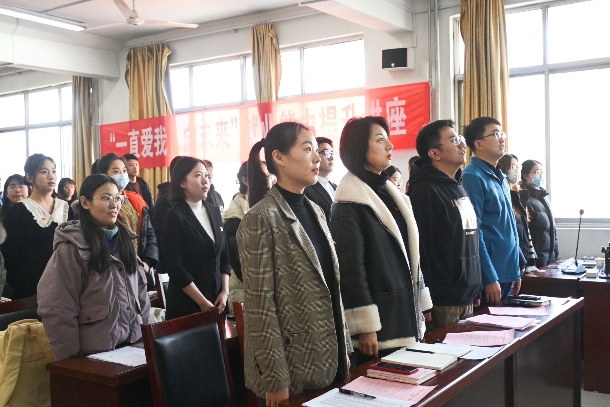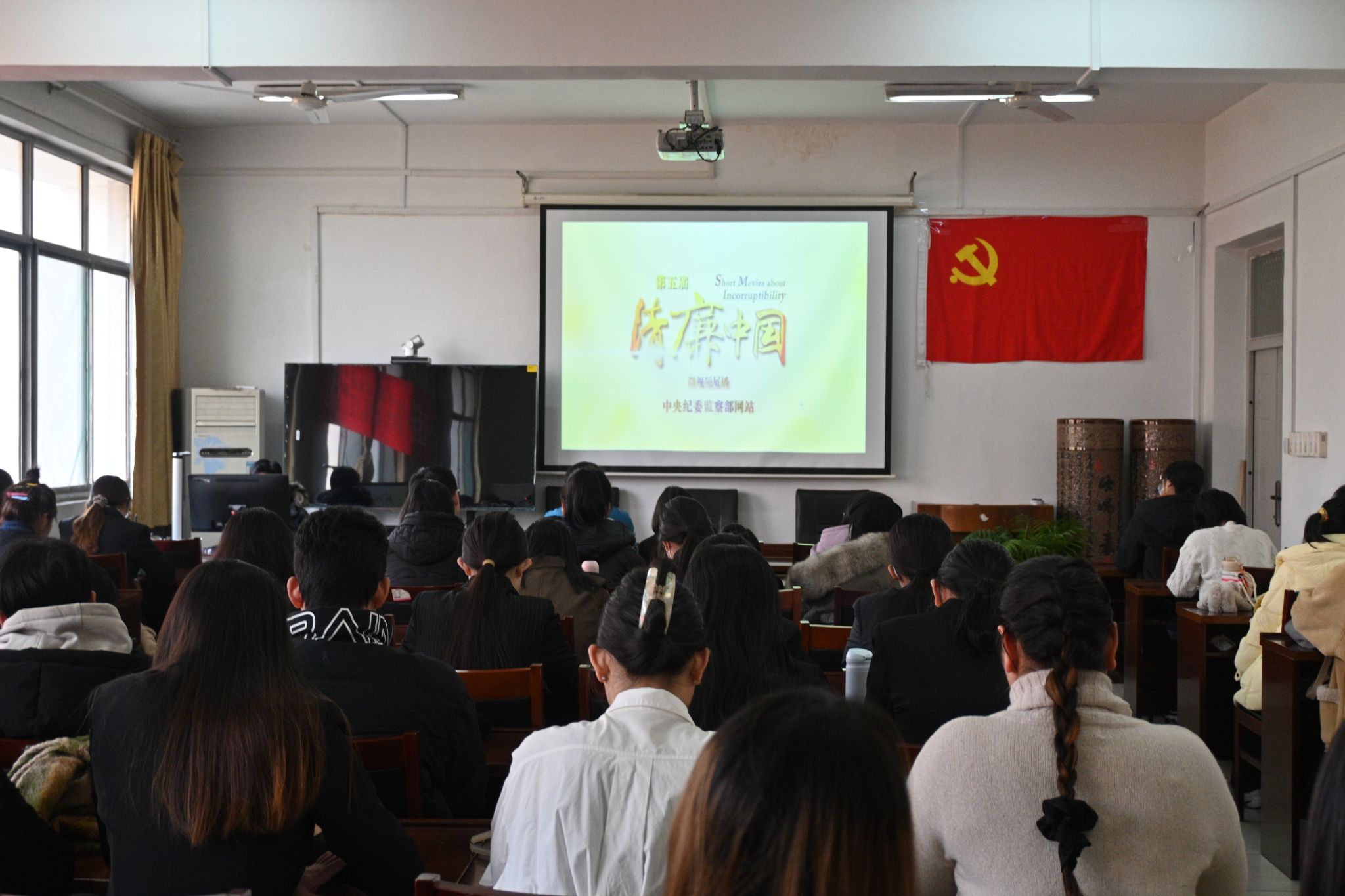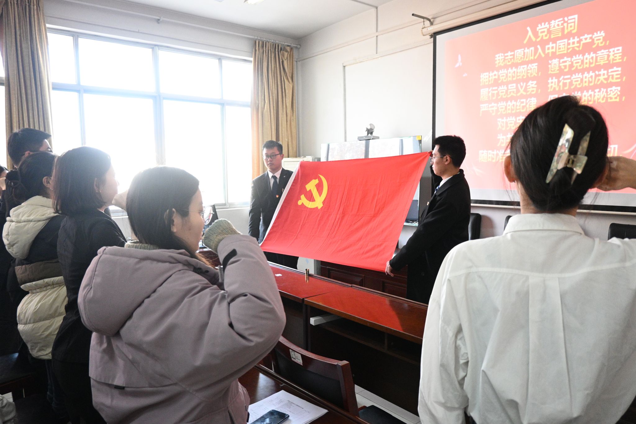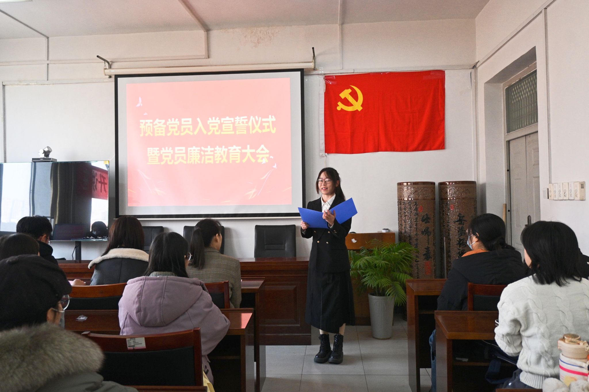 12月12日,文学院在舜耕书院举行2023年下半年预备党员入党宣誓仪式暨学生党员廉洁教育活动,学院党委副书记、副院长潘颖,各学生党支部书记,学生党员代表以及本学期新发展的56名预备党员参加会议,会议由文学院学办主任兼团委书记敖游主持。