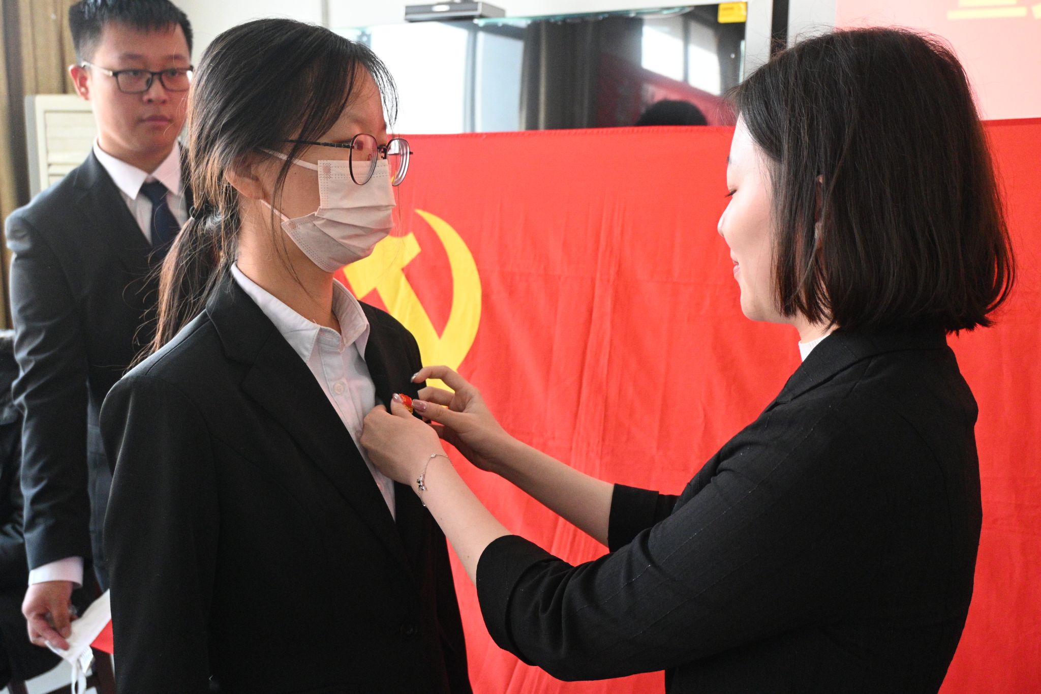 入党宣誓仪式在庄严的《国际歌》中拉开序幕。首先,学生中文党支部书记张莉同志宣读宣誓人员名单。随后,各党支部书记和学生党员代表为本次新发展预备党员佩戴党徽。在新发展党员代表秦文迈的领誓下,全体预备党员面向鲜红的党旗,举起右拳,进行庄严宣誓。“我志愿加入中国共产党,拥护党的纲领,遵守党的章程,履行党员义务……”铿锵的誓言、坚定的承诺,带领着党员同志们回溯精神的根脉,激发前行的动力,坚定理想信念,牢记使命担当。宣誓结束后,学生中文党支部兰翊君作为预备党员代表发言,表示将牢记党的初心使命,志存高远、积极进取、脚踏实地,努力成为新时代社会责任的担当者与履行者。