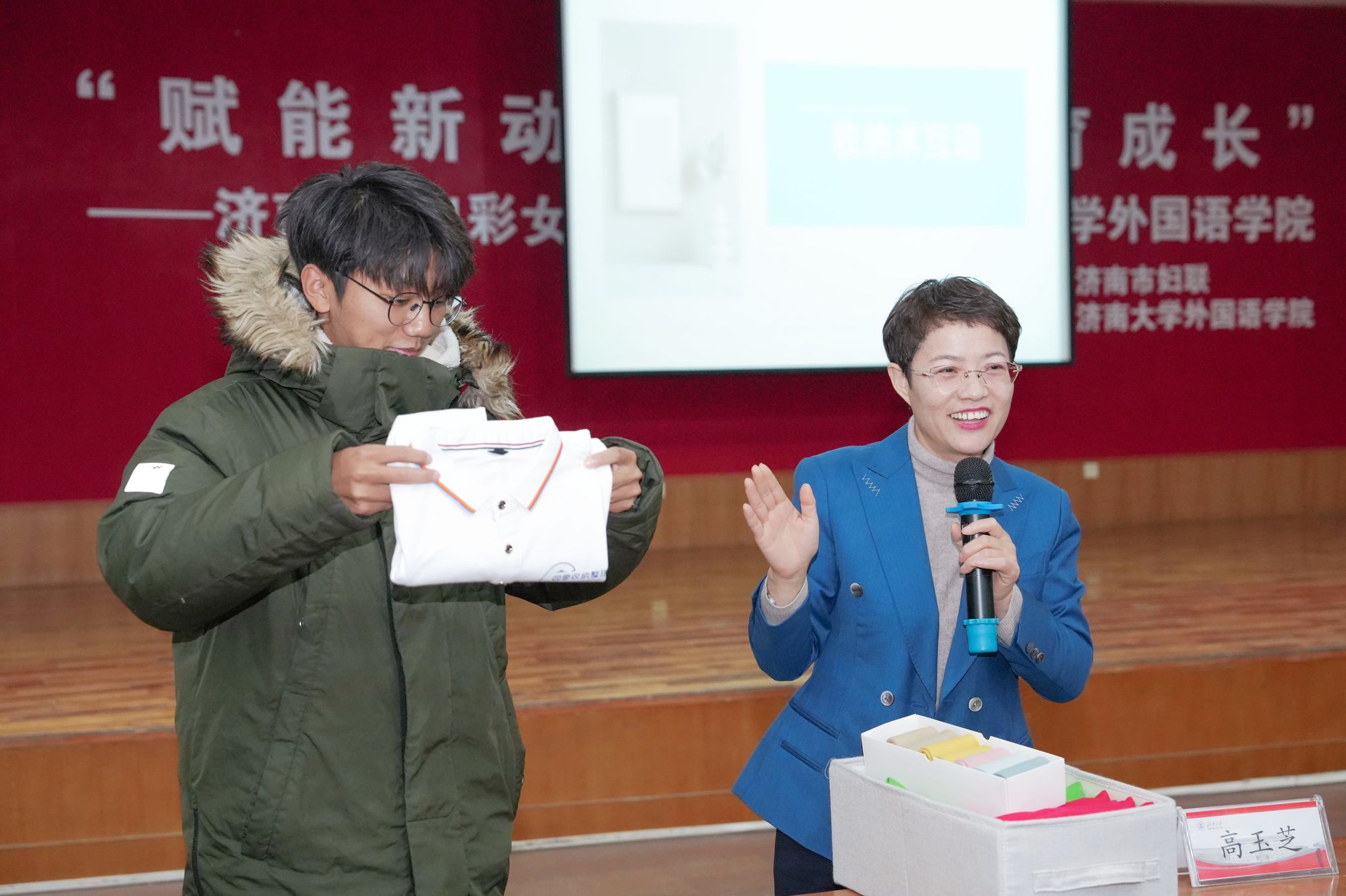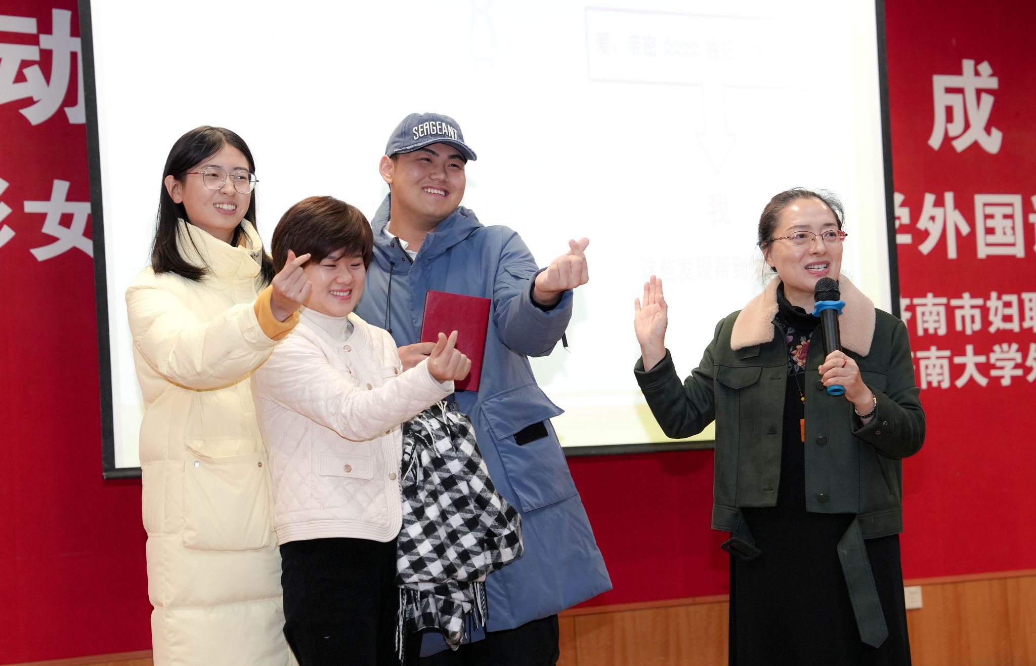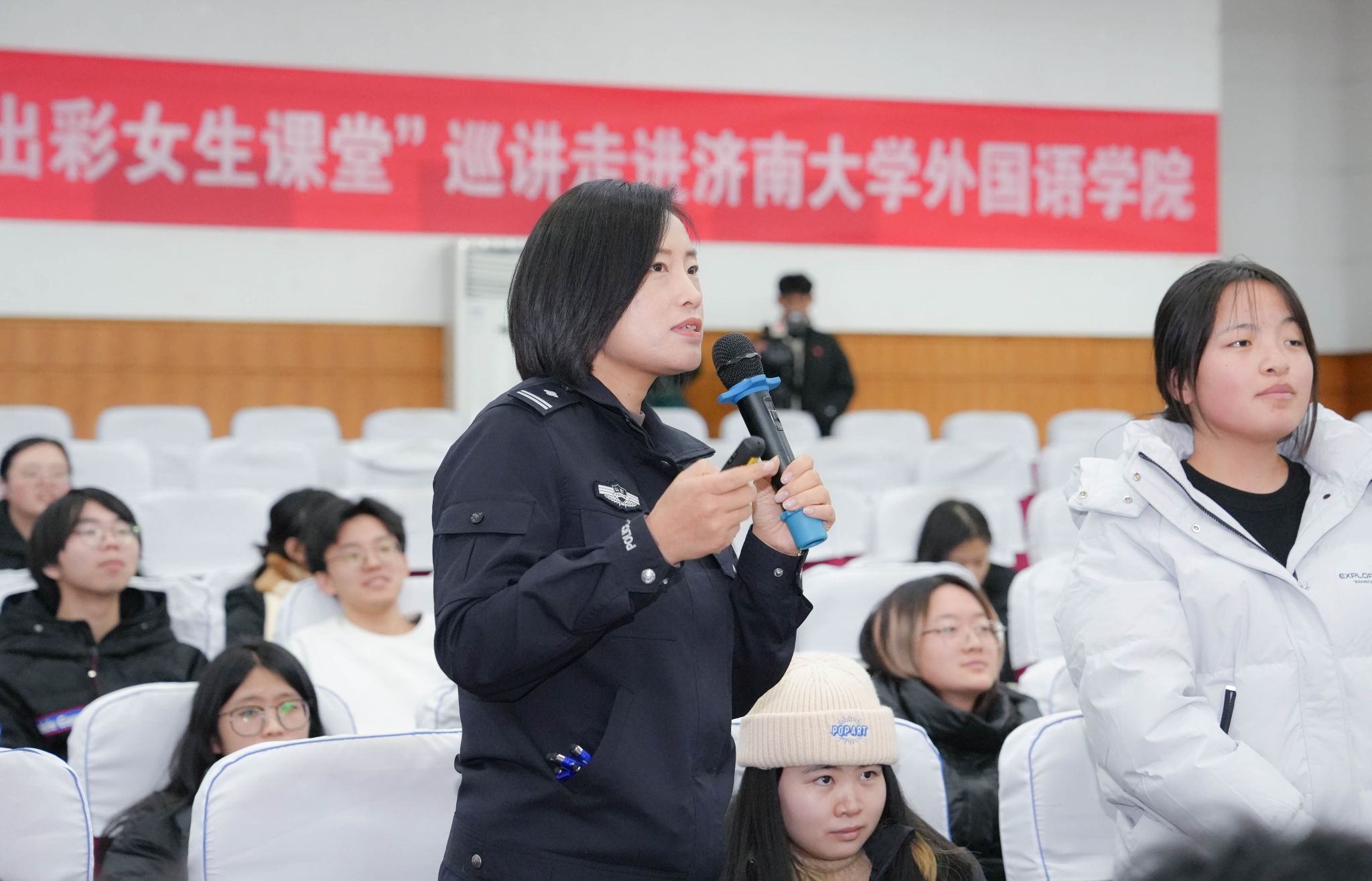 为全面提升大学生职业素养,激励大学生做有理想、敢担当、能吃苦、肯奋斗的新时代青年,12月12日,济南市“出彩女生课堂”巡讲活动在第二报告厅隆重举行。活动以“赋能新动力 护航育成长”为主题,特别邀请阳光大姐集团董事长、全国优秀共产党员、全国妇联执委、中国妇女十三大代表、全国三八红旗手标兵卓长立,山东天耀缘通健康咨询有限公司副教授如心,历下公安分局网安大队警务技术一级主管王瀚玉,济南阳光大姐服务有限责任公司培训师王小霞进行授课。济南市妇联宣传部部长杨小朋,济南市妇联宣传部副部长李阳,学院党委副书记、副院长郭英,学院副处级组织员李春海及300位师生代表参加了本次活动。活动由外国语学院学生工作办公室主任刘毅主持。
