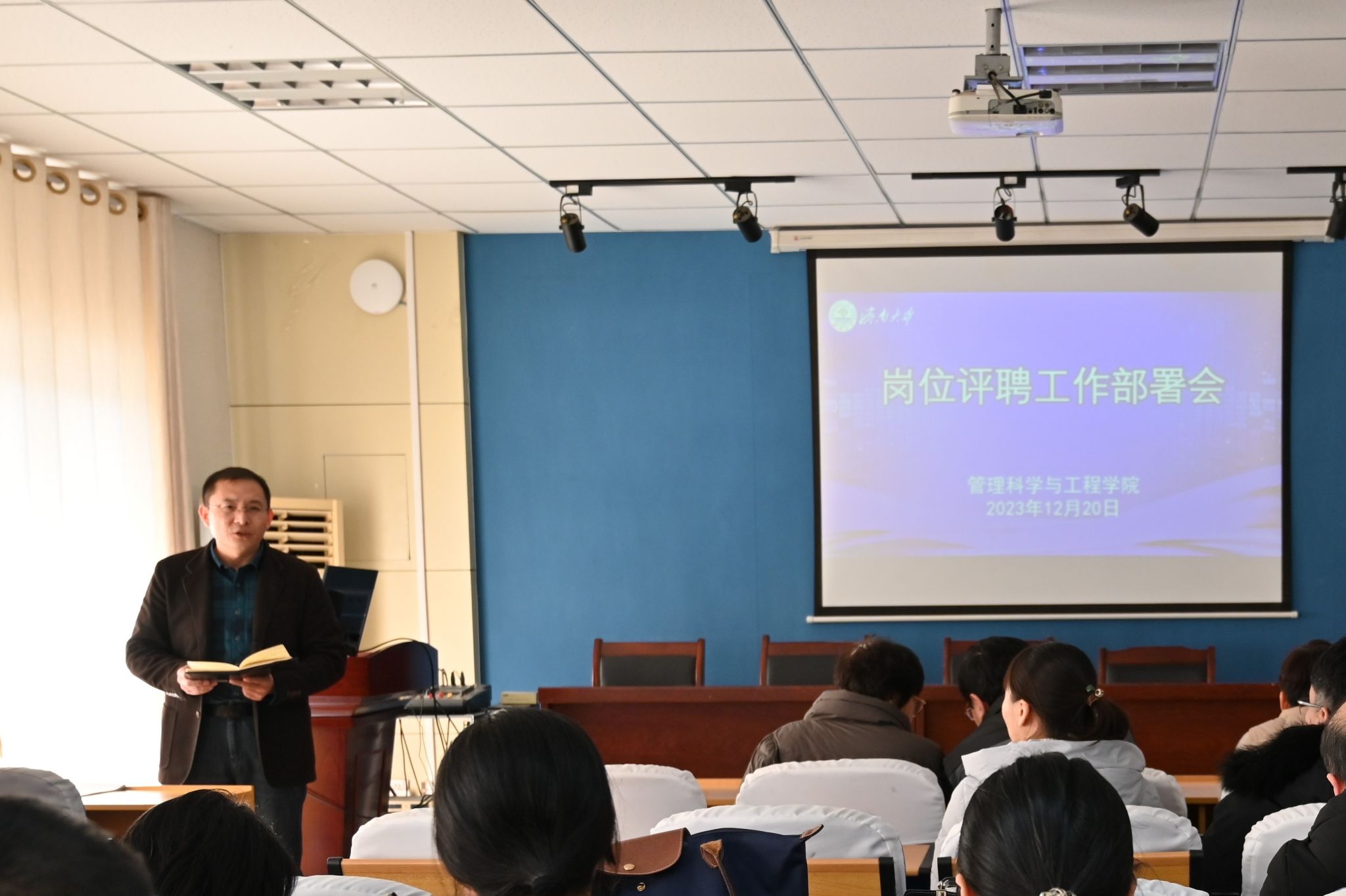 12月20日下午,管理科学与工程学院在经管楼308会议室召开岗位评聘工作部署会。学院领导班子成员、全体教职工参加会议。会议由学院党委副书记、副院长郭华主持。