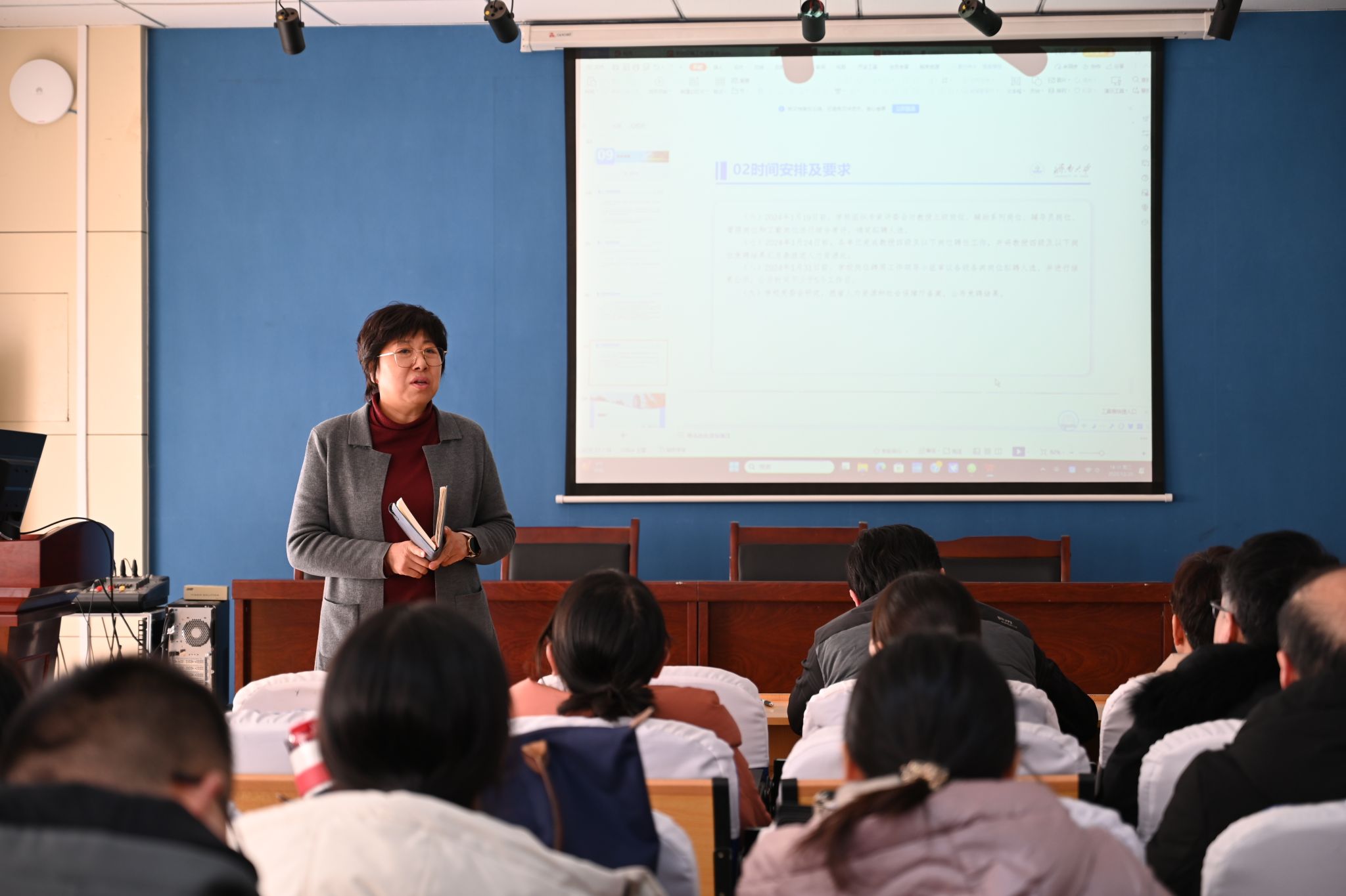 会上,院长助理常相全通报了学校教学档案专项检查相关情况。郭华在总结时讲到,岗位评聘工作事关师资队伍建设水平、事关学院长远发展、事关教职工切身利益,全院教师要贯彻落实好校、院工作部署,认真学习相关文件,了解熟悉政策,确保岗位评聘工作顺利实施。