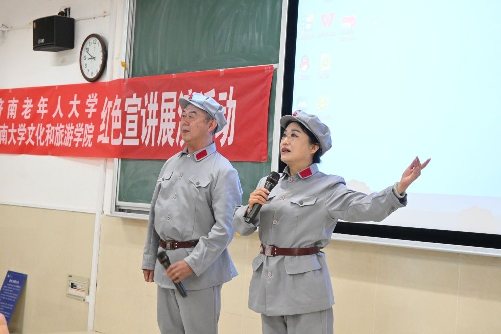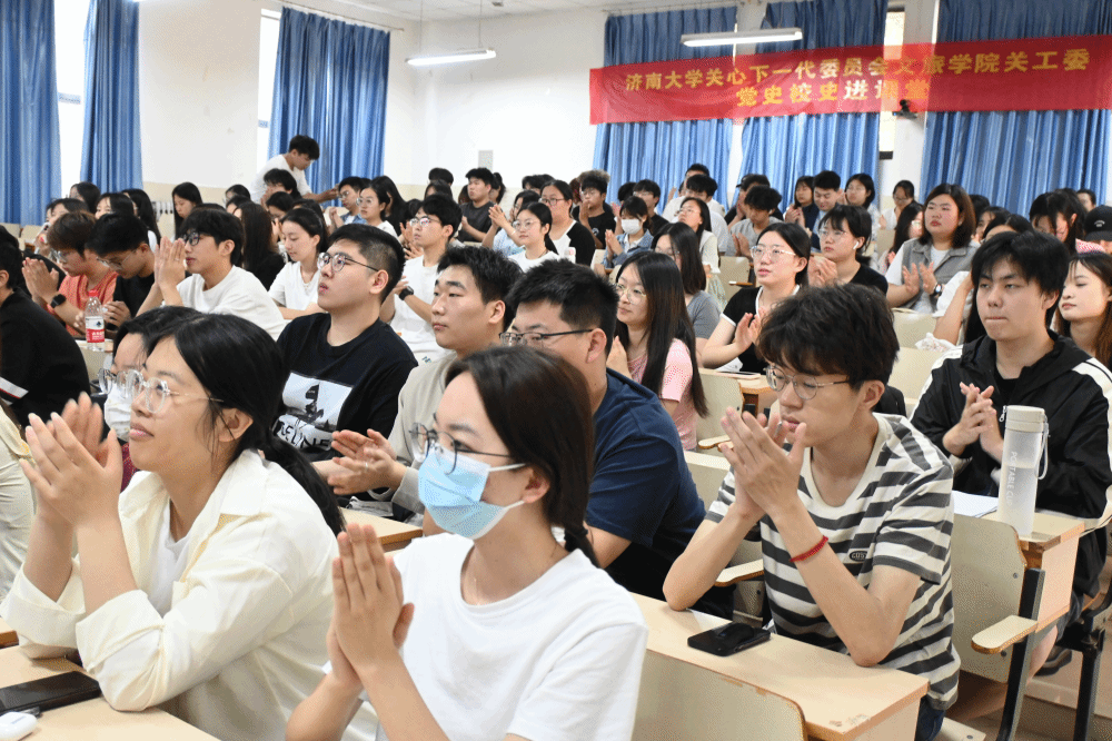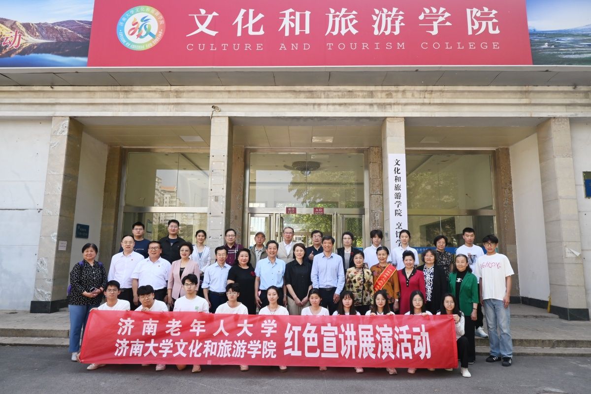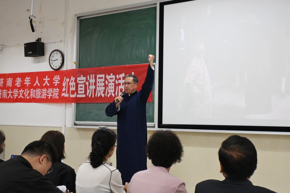 为进一步弘扬爱国主义精神,传承红色基因,加强党史学习教育,深化校际交流合作。4月27日,文化和旅游学院与济南老年人大学、best365官网中文版登录关心下一代工作委员会(以下简称关工委)联合开展了红色宣讲展演暨党史校史进课堂活动。济南老年人大学关工委副主任、志愿服务团团长张建军,best365官网中文版登录关工委副主任梁伟,best365官网中文版登录离退休工作处处长、关工委秘书长高卫红,best365官网中文版登录文化和旅游学院党委书记孟德洋,学院党委副书记、副院长信苏珊出席活动,济南老年人大学宣讲团、文旅学院全体学生党员、新一期积极分子、青马工程学员、教师代表共200余人参加活动。