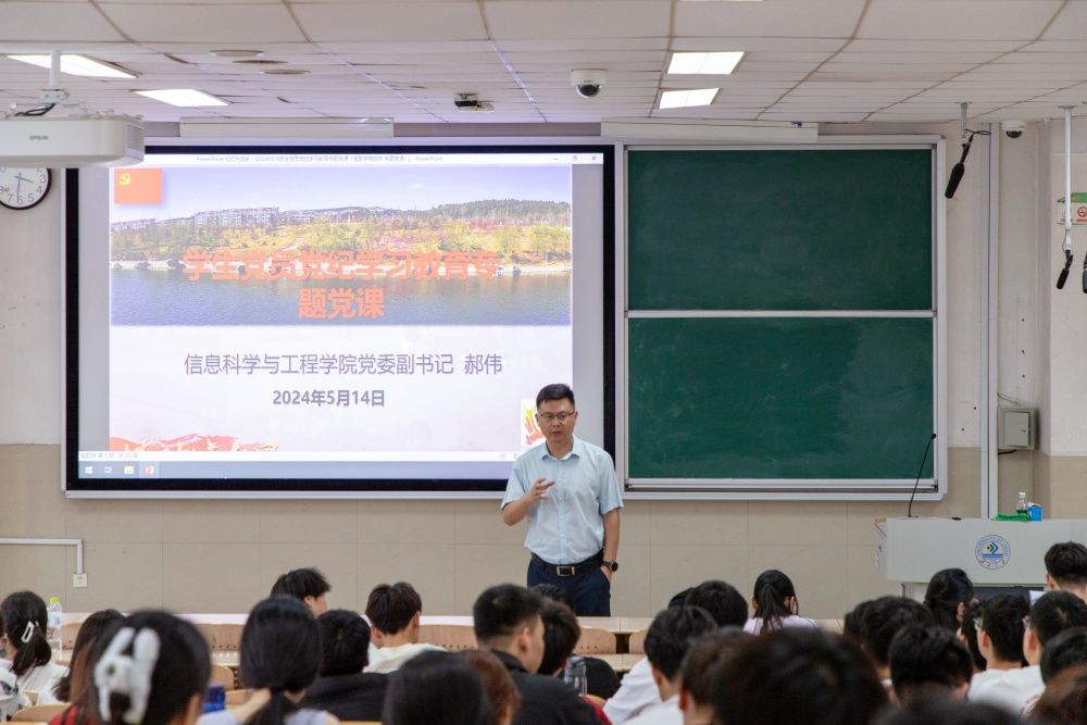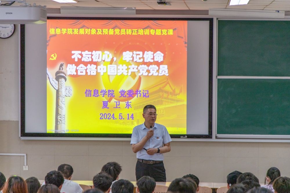为做好学生党员的教育、管理和培养工作,推进党纪学习教育走深走实,进一步坚定党组织发展对象和预备党员的理想信念,提高党性修养,强化使命担当,增强纪律和规矩意识,5月14日,信息科学与工程学院开展本学期党组织发展对象和预备党员转正培训专题党课。学院党委书记夏卫东、党委副书记郝伟分专题为大家讲授党课,本学期党组织发展对象和即将转正的预备党员近200人参加了培训。