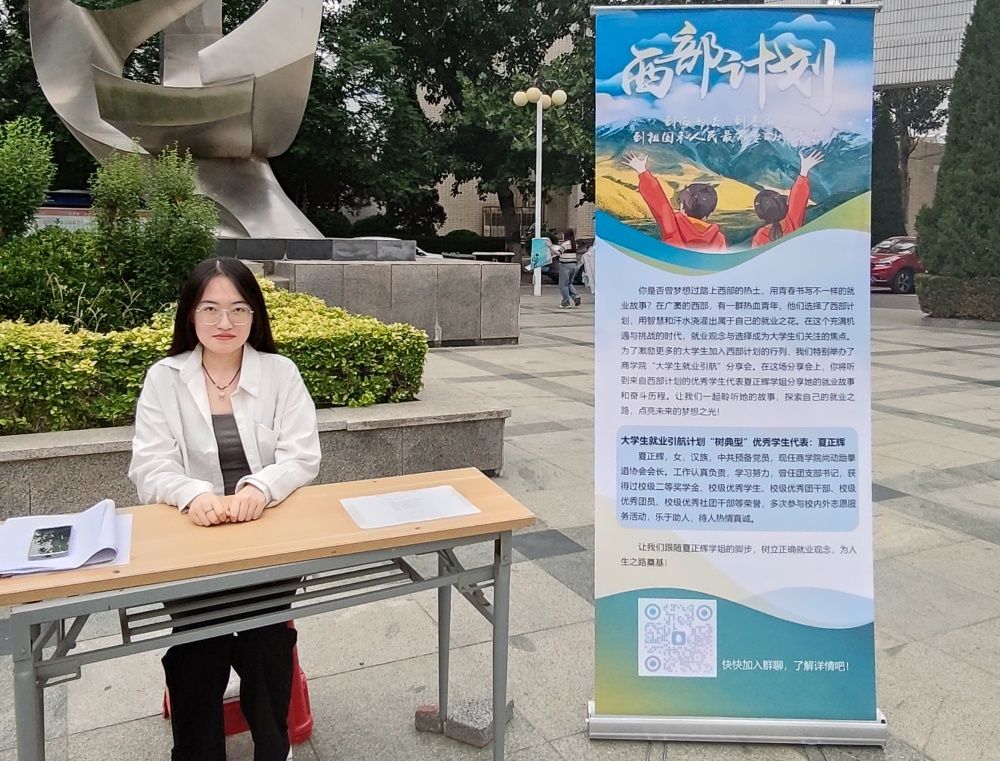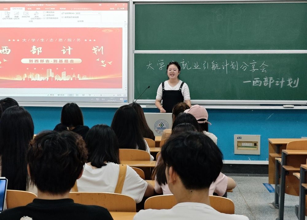 活动现场,夏正辉学姐从工作内容、实施步骤、保障机制、工作要求四个方面对西部计划相关内容进行解读,分享了自己选择就业方向的心路历程,同时也鼓励大家,在这个充满机遇和挑战的舞台,每个人都可以用自己的智慧和汗水书写出属于自己的就业故事,我们要在挑战中成长,在服务中收获,让青春在奉献中闪光。