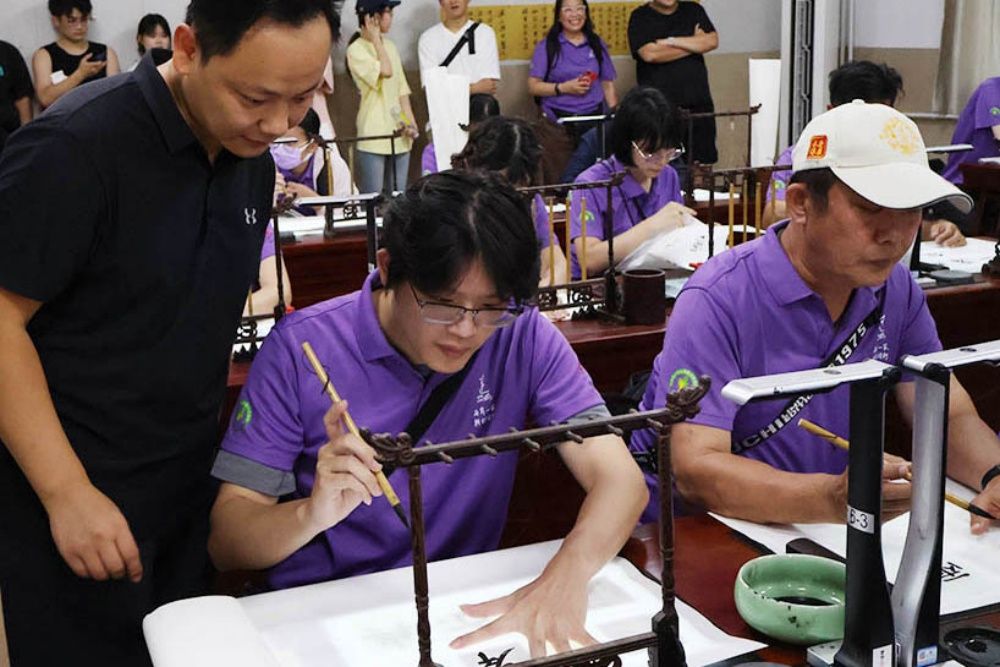 为了让台湾师生更好地感受中国传统文化的魅力,美术系王小飞老师现场绘制中国传统水墨画团扇,精湛的技艺引得师生们赞叹不已。美术系丁奕翔老师精心设计的漆面扇体验项目,也让同学们跃跃欲试。书法系成海明博士在书法专业教室指导台湾青年学生体验中国传统书法艺术,同学们一笔一划认真书写了“两岸一家 与你同行”主题作品,在笔墨之间感受着两岸同根同源的文化底蕴。