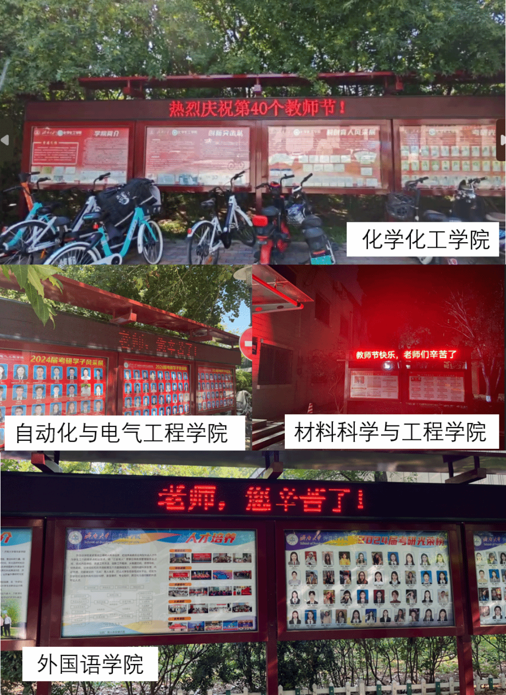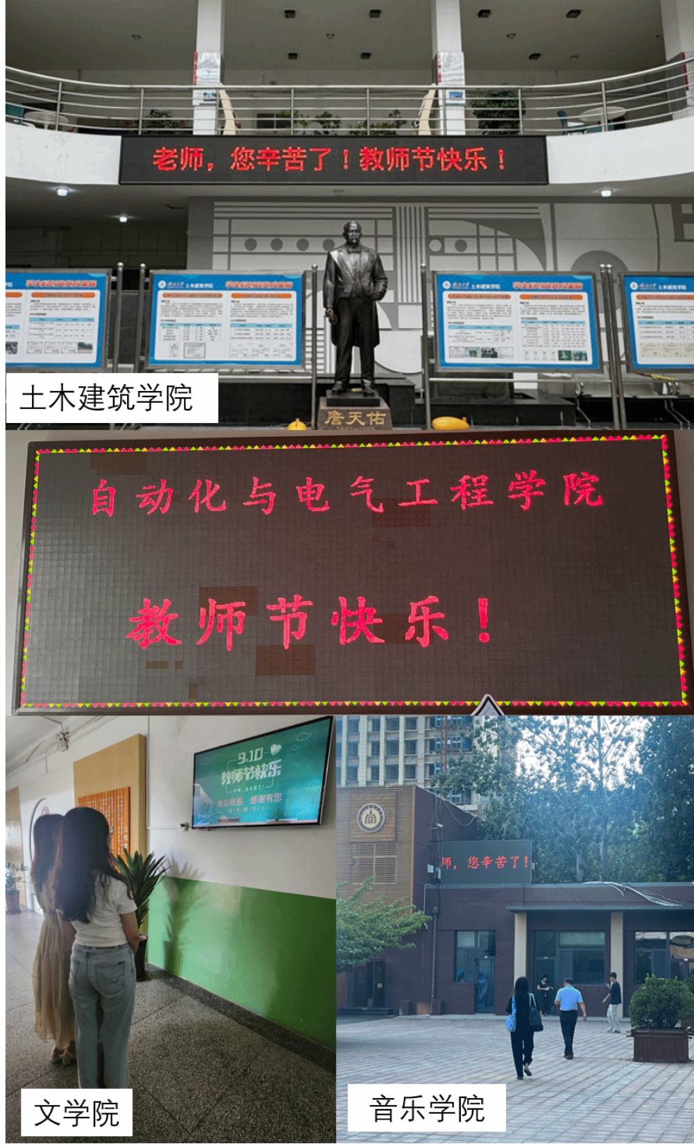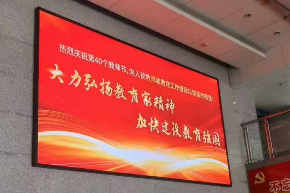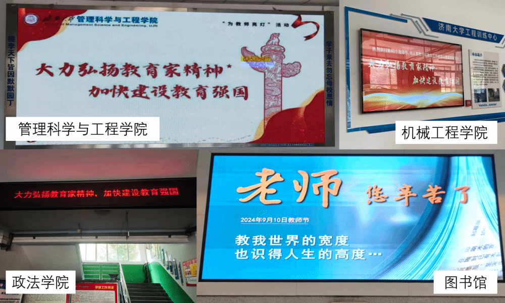 在学校的办公楼、图书馆、各学院和教学楼前,随处可见电子屏幕滚动播放“大力弘扬教育家精神,加快建设教育强国”“老师,您好!”“教师节快乐!”“老师,您辛苦了!”等祝福语,温暖的话语传递出尊师重教的力量,引得师生们纷纷驻足观看。