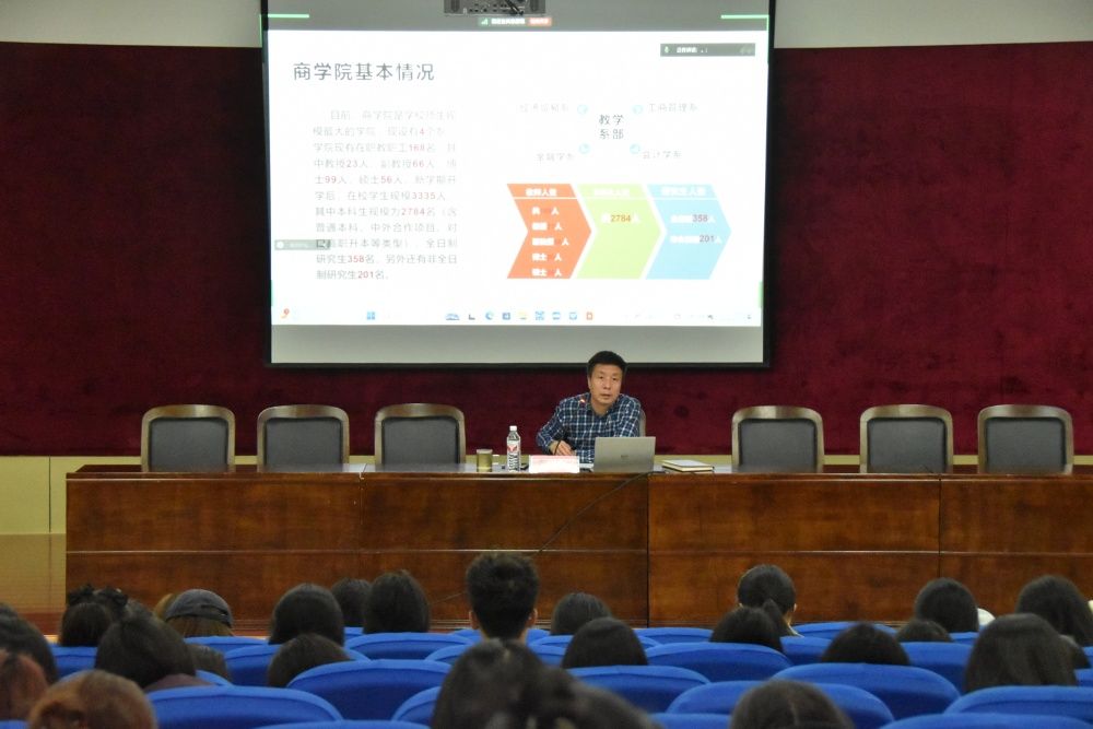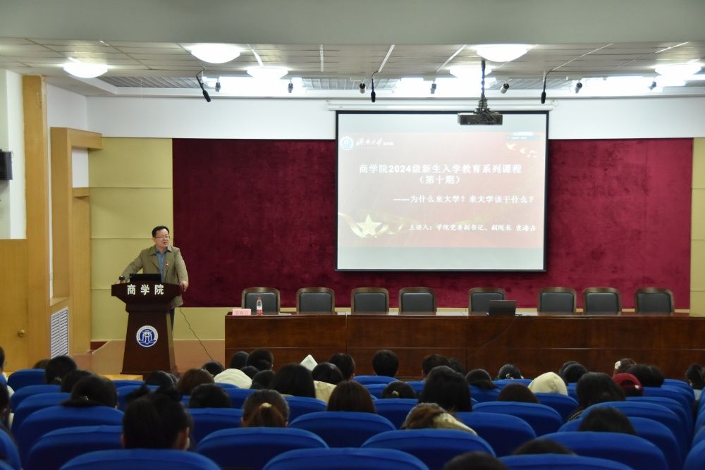 商学院党委副书记、副院长袁海占围绕“为什么来大学?来大学该干什么?”,从使命担当与个人成长视角出发,深入探讨了专业学习、能力提升和资源利用等规划未来生活的重要方面,为新时代大学生指明了方向。商学院副院长刘毅介绍了学院历史、科研平台、课程设置,助力新生认知专业方向,拓宽知识视野,树立远大志向。正处级巡查员郝军阐释学涯应变之道,帮助新生开启大学旅程,规划职业发展,适应未来社会发展的关键需求,努力成为国家所需的高端人才。