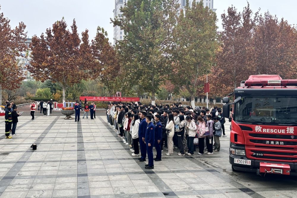活动期间,济南市消防救援支队的专业消防员们为师生们带来了一场内容丰富、形式多样的消防安全知识盛宴。济南市消防救援支队全媒体中心工作室负责人吴成海结合实际案例,深入浅出地讲解了火灾的成因、预防措施、报警方法以及初期火灾的扑救和逃生自救技巧等知识。一个个触目惊心的火灾事故画面,让师生们深刻认识到消防安全的重要性和火灾的巨大危害,进一步提高了大家的消防安全防范意识。在消防器材展示与实操演练环节,消防员们向师生们展示了灭火器、消火栓、消防水带、防毒面具等常用消防器材的种类、功能和使用方法,并进行了现场演示,师生们踊跃参与,在消防员的耐心指导下,亲自上手操作灭火器等消防器材,进行灭火演练,切实掌握了消防器材的使用技能,增强了应对火灾突发事件的能力。此外,活动还设置了实验室消防应急疏散演练环节。随着警报声响起,师生们按照预定的疏散路线,迅速、有序地从经管楼三楼“标准化实验室”撤离到安全地带。整个演练过程组织严密、秩序井然,达到了预期效果。演练结束后,消防员对演练活动进行了总结和点评,指出了演练过程中存在的问题和不足,并提出了改进意见和建议。