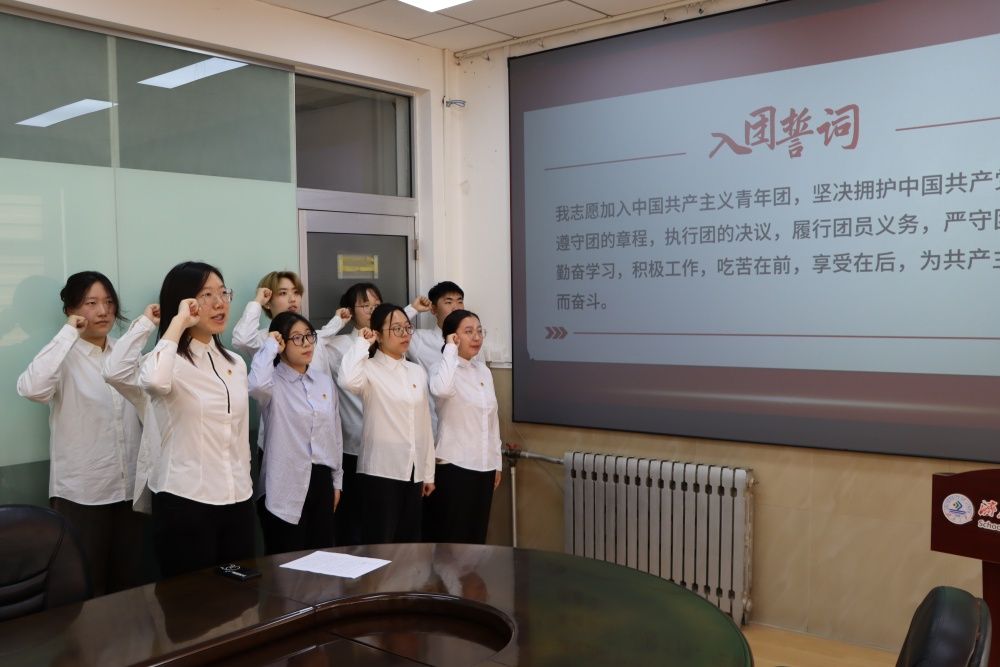 伴随着庄严的国歌声,仪式正式拉开序幕。吴杨洋宣读了外国语学院2024年下半年新发展团员名单。李春海、刘毅、吴杨洋、王艺笑逐一为新团员颁发团徽徽章和团员证。学院新团员们在优秀团员谢颖圣的带领下,向团旗发出了坚定的誓言。