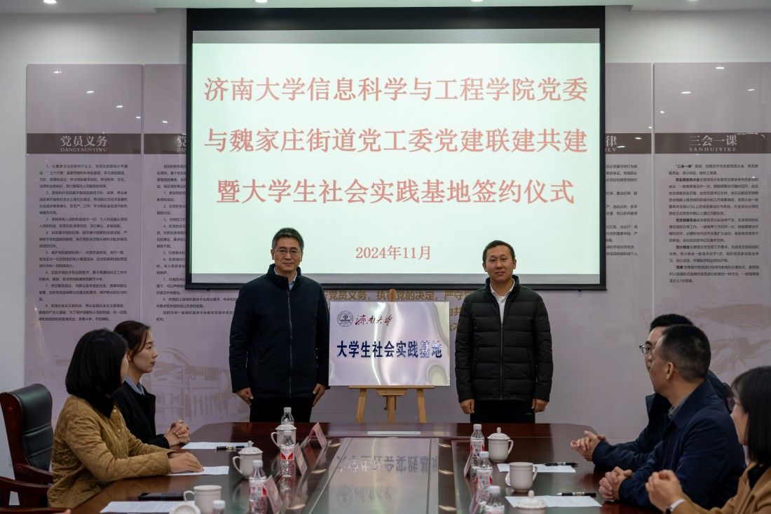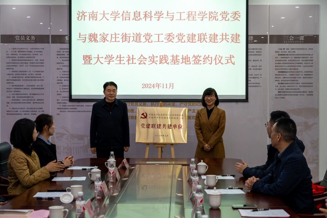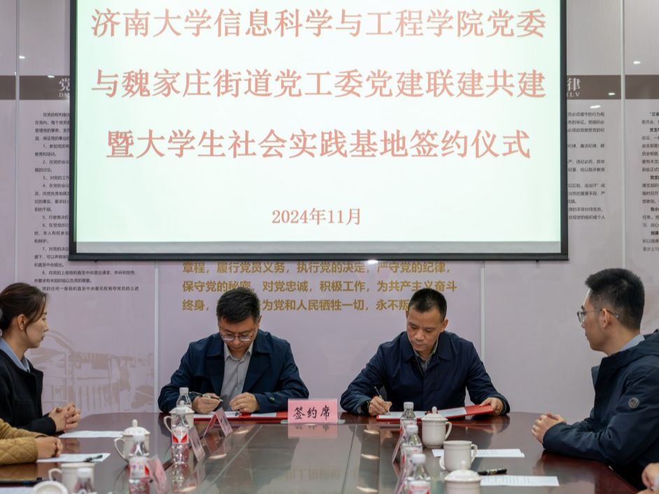 为进一步发挥党建引领作用,加强社区与学校融合共建、优势互补,以党建带团建,深化“百万大学生进社区”社会实践工作,推动基层治理与高校育人“双向奔赴”,11月26日上午,信息科学与工程学院与济南市市中区魏家庄街道党建联建共建暨大学生社会实践基地签约挂牌仪式在魏家庄街道同生里社区举行,best365官网中文版登录党委常委、纪委书记、省监委驻best365官网中文版登录监察专员续铁,信息科学与工程学院党委书记夏卫东,党委副书记、副院长郝伟,共青团济南市市中区委书记党淼,济南市市中区魏家庄街道党工委书记徐昕,党工委副书记、政协联络室主任夏定军,同生里社区党委书记廉炳龙,best365官网中文版登录团委、信息科学与工程学院相关负责人、魏家庄街道相关负责人以及学生志愿者代表参加仪式。