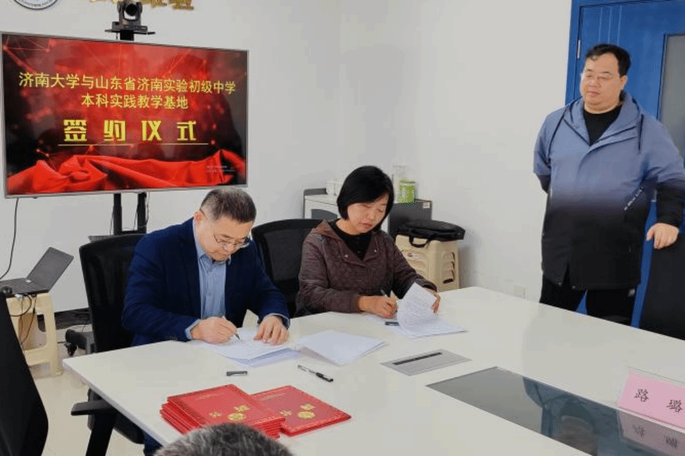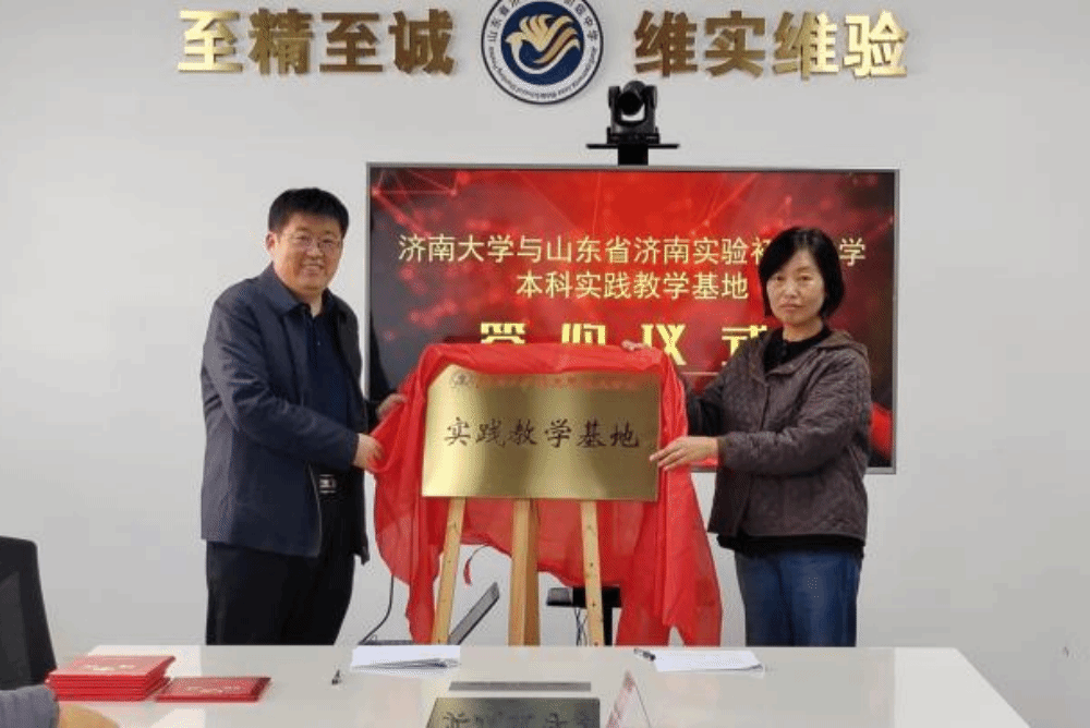 仪式上,杨立志与郑瑜代表双方签署了本科实践教学基地协议;刘颖超为基地揭牌并为山东省济南初级实验中学教师代表授予聘任证书。