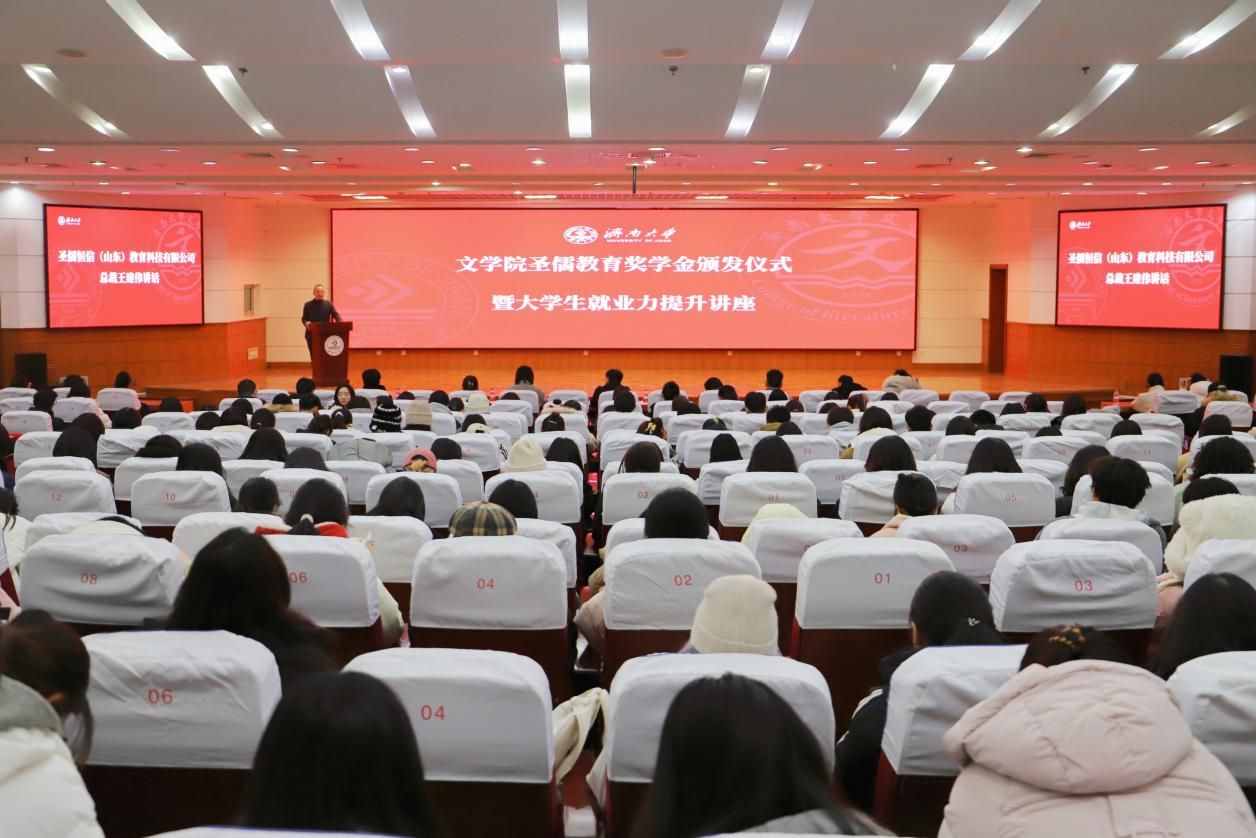 岁末寒天同聚首,以奖促学励鸿鹄。12月19日,文学院圣儒教育奖学金颁发仪式暨大学生就业力提升讲座在best365官网中文版登录第二学术报告厅举行。圣儒恒信(山东)教育科技有限公司总裁王建伟,副总裁张文豪、孟瑶,学院党委书记董海军,院长范丽敏,党委副书记、副院长潘颖,文学院辅导员、班主任、学生代表等四百余人参加本次颁发仪式。仪式由文学院学办主任兼团委书记敖游主持。