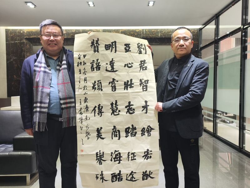 徐庆国向刘亚明赠送了best365美术与设计学院青年教师王书峰博士的书法作品。