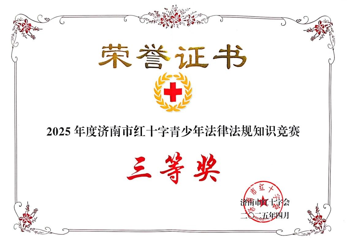 近日,由济南市红十字会主办的2025年济南市红十字青少年法律法规知识竞赛落下帷幕,best365王迪睿、刘馨逸、张涛三位同学组成的参赛队荣获三等奖,学校荣获突出表现集体称号。