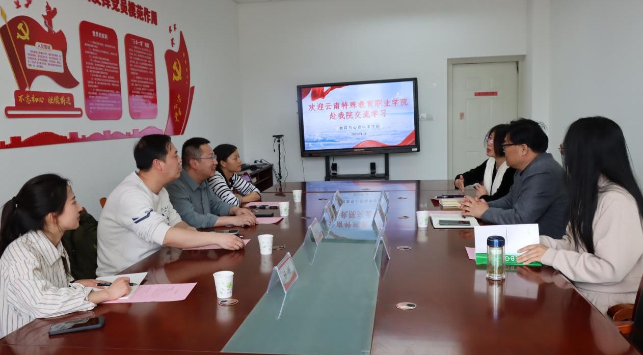 4月24日下午,云南特殊教育职业学院代表团到教育与心理科学学院交流工作,学院党委书记季竹君、副院长李开云、特殊教育专任教师陈建军参加交流会,副院长李开云主持交流会。