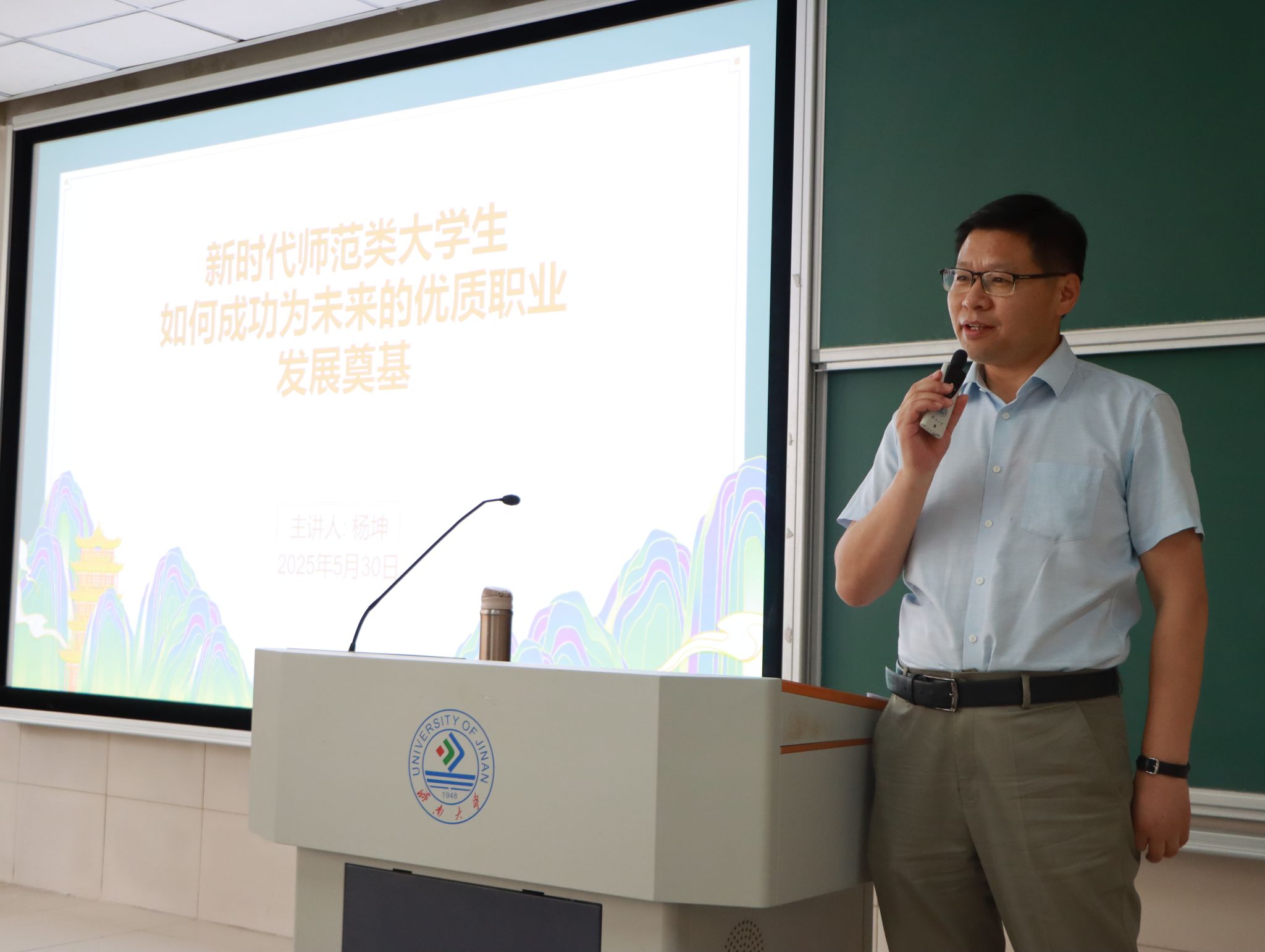 杨坤从“读懂时代答卷,珍惜教育东风;认清职业特性,走向辉煌征程;积淀教师素养,夯实从教基础;找到科学方法,走好奋斗之路;直面问题挑战,实现职业之梦”等五个方面,详细阐释了新时代师范大学生如何为未来教师专业优质发展做好准备。他提出教师是人才培养的核心力量,强调要以热爱为内驱力推动职业发展,在人工智能时代持续创新教育教学模式,通过渊博学识、高尚品德和卓越才智引领学生成长,坚守为党育人、为国育才使命,争做“四有好老师”,当好“四个引路人”。