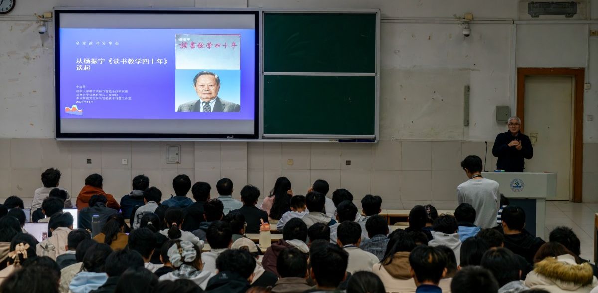 随后,李金屏教授以杨振宁院士的著作《读书教学四十年》为切入点,围绕“勿忘历史,珍惜当下;好好学习,报效祖国”的主题,为在场师生带来了一场内容丰富、启迪深刻的分享。李教授结合自身求学与科研工作的亲身经历,分享了独到的读书心得与人生感悟,并就学业规划与个人成长为同学们提供了切实可行的指导,现场反响热烈。
